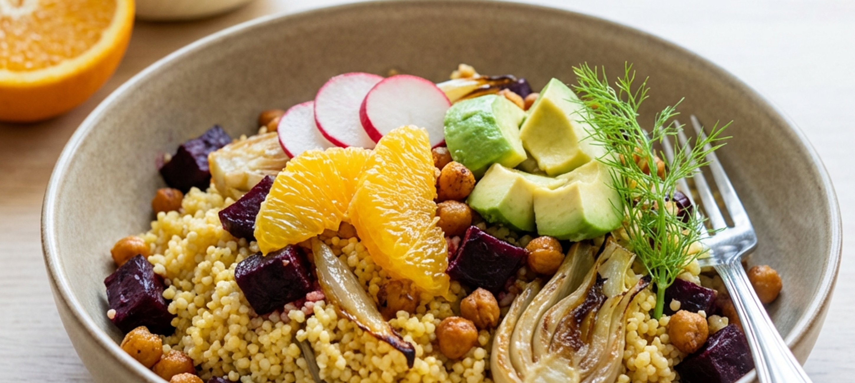 - 5While the vegetables are baking, peel and segment the orange, thinly slice the radishes, and dice the avocado.
