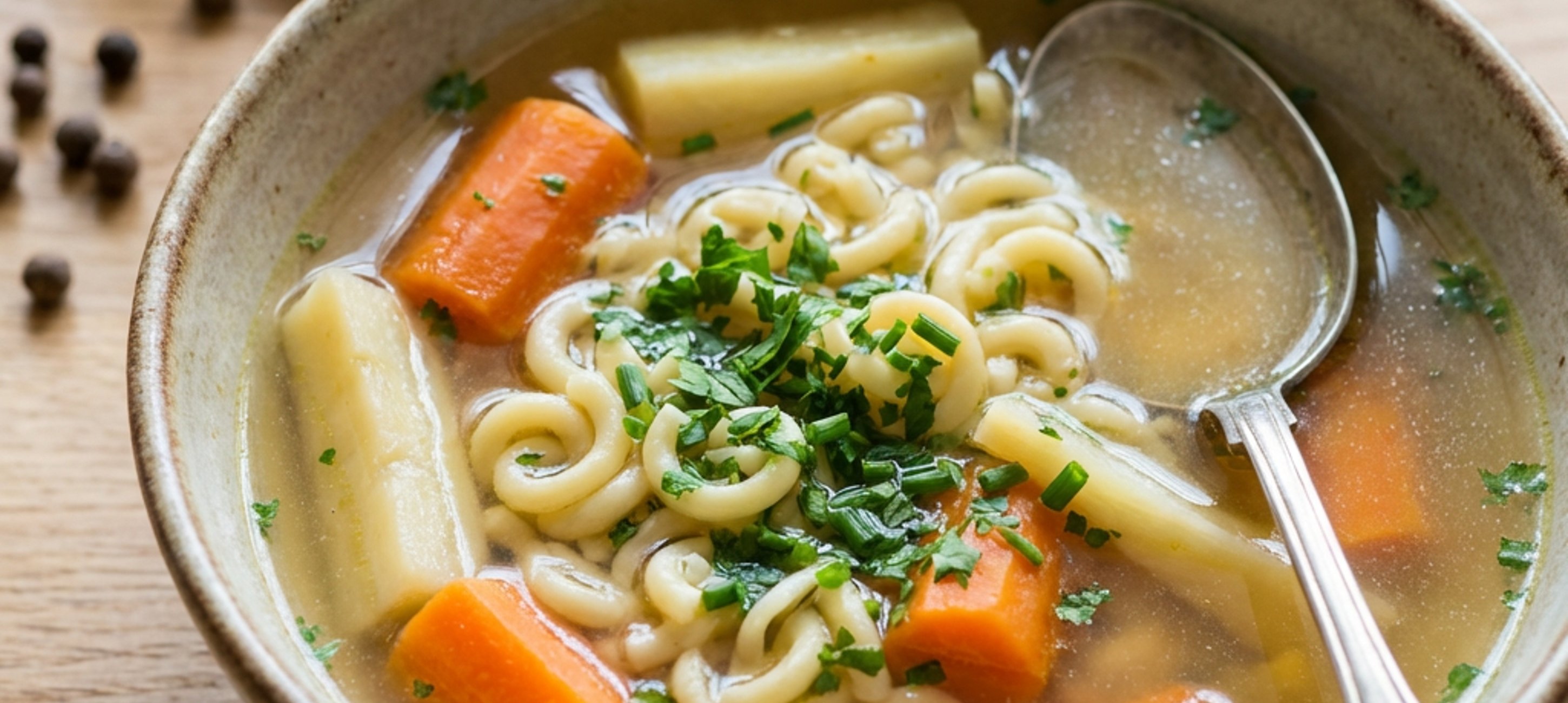 You can put the peppercorns in a small piece of cheesecloth or a tea infuser, so you don't have to fish them out one by one. You can also cook a bell pepper and a tomato in it if you like. Instead of beef, you can, of course, prepare it with pork, chicken, or guinea fowl. Avoid industrial chicken. It's not suitable for soup.
