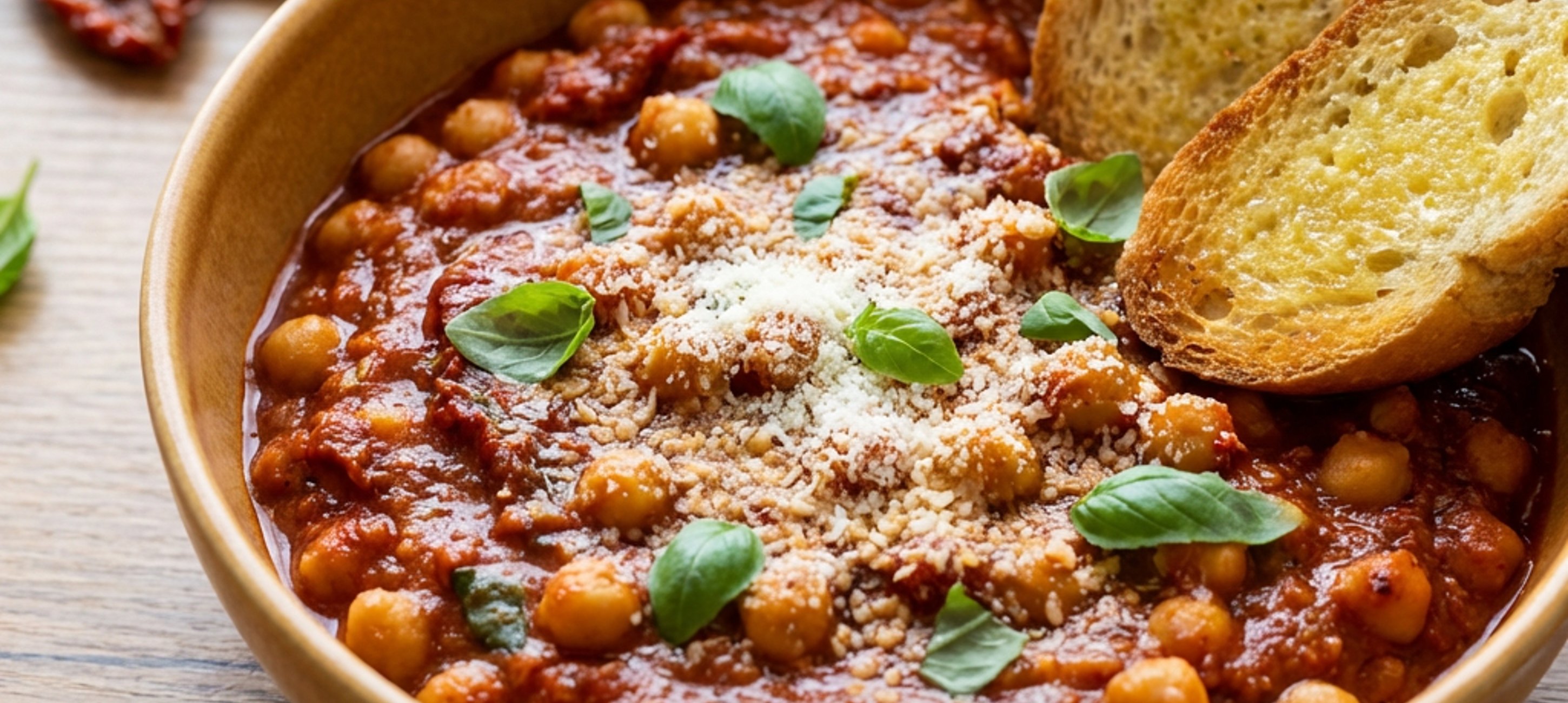 Sprinkle a little more Parmesan, basil, and crushed red pepper on top of the chickpea mixture. Serve with the toasted baguette.