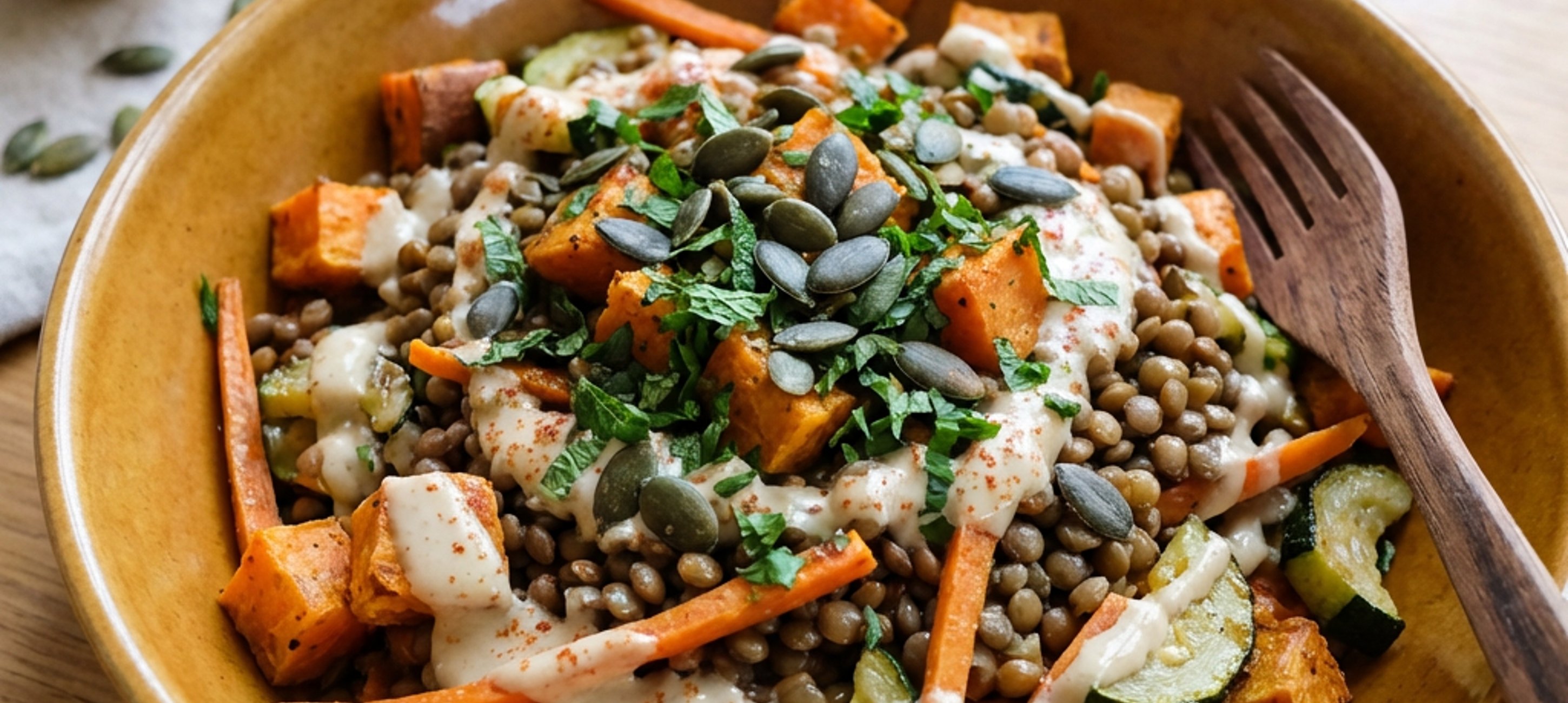 Finally, stir in the seeds and cook for a few more minutes. Remove from heat and add the lentils, broth powder, lemon zest, mint, and parsley.