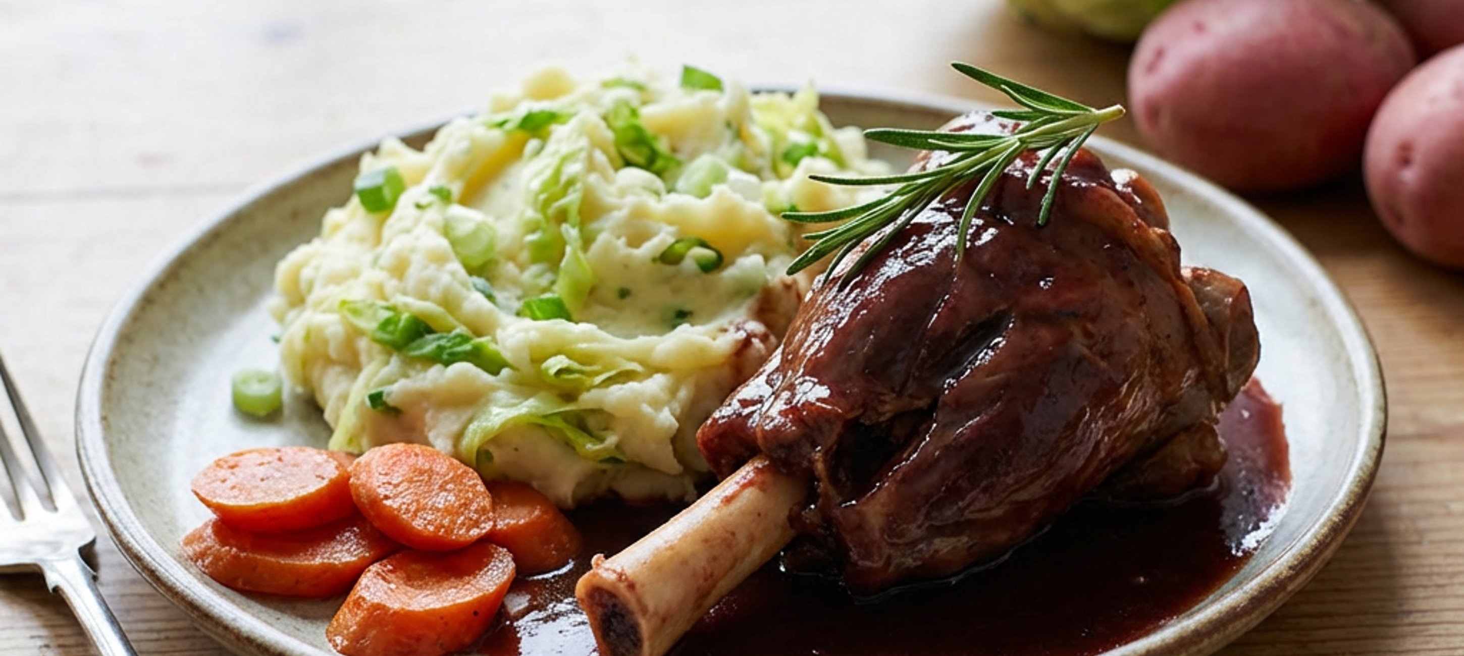 - 7Amíg a hús sül, készítsd el a colcannont. Tedd a burgonyát egy fazékba, önts rá annyi hideg vizet, hogy 2-3 cm-rel ellepje, majd adj hozzá két evőkanál sót. Forrald fel, és főzd 15-20 percig, amíg a burgonya megpuhul. Szűrd le, és hagyd gőzölögni, hogy a felesleges nedvesség elpárologjon.