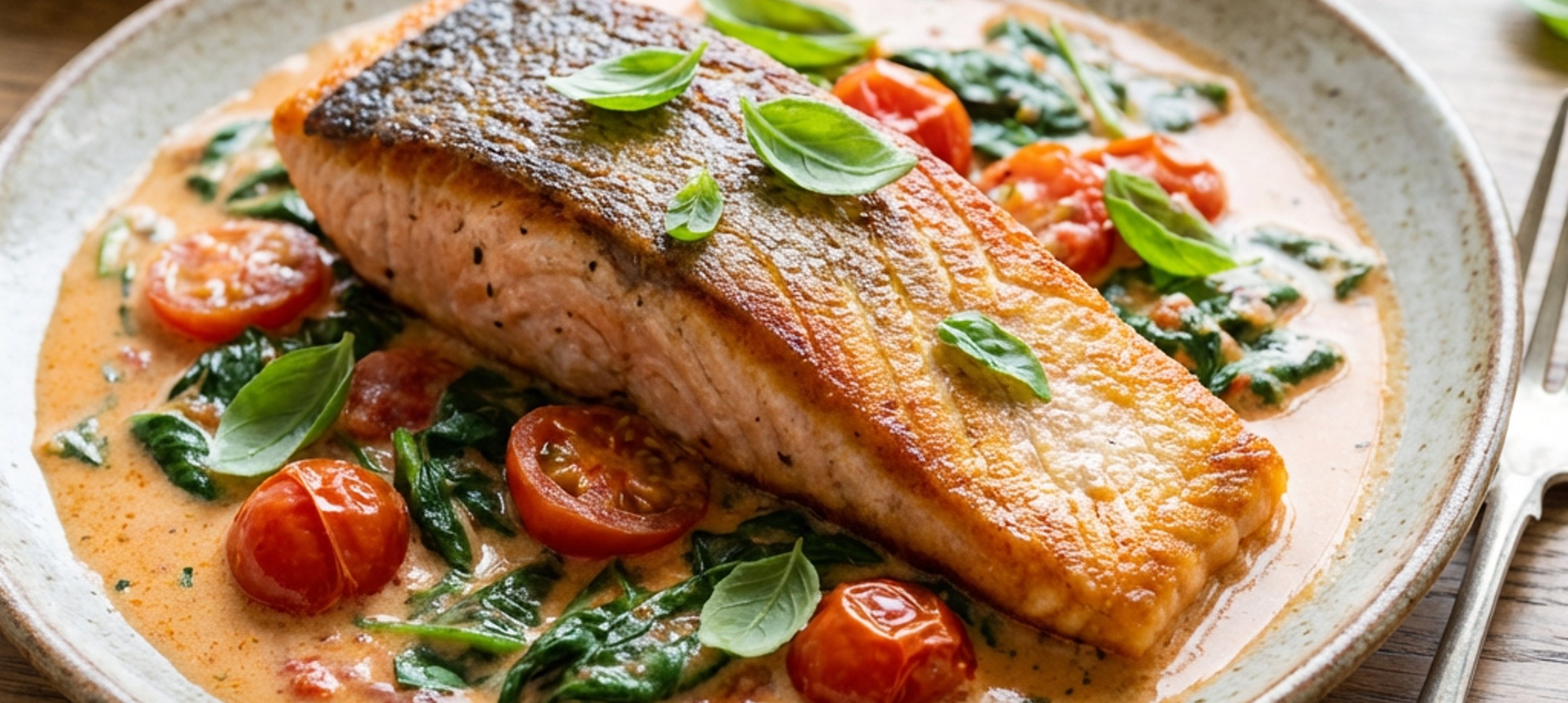 - 3Return the salmon fillets to the sauce and let it simmer gently until the sauce is thick and velvety and the salmon is fully cooked through - this will take a few minutes. Finally, stir the baby spinach into the sauce, and you can also add finely chopped basil. Serve with pasta or roasted potatoes.