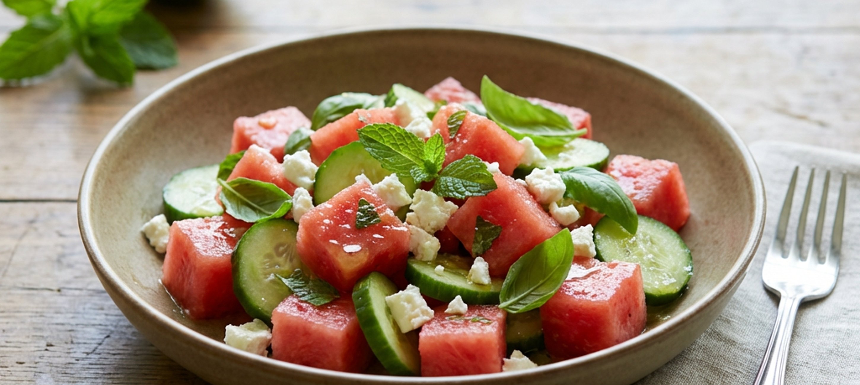 - 1Dice the watermelon, place it in a bowl with the sliced cucumber, crumbled feta, and fresh herbs. Mix gently.