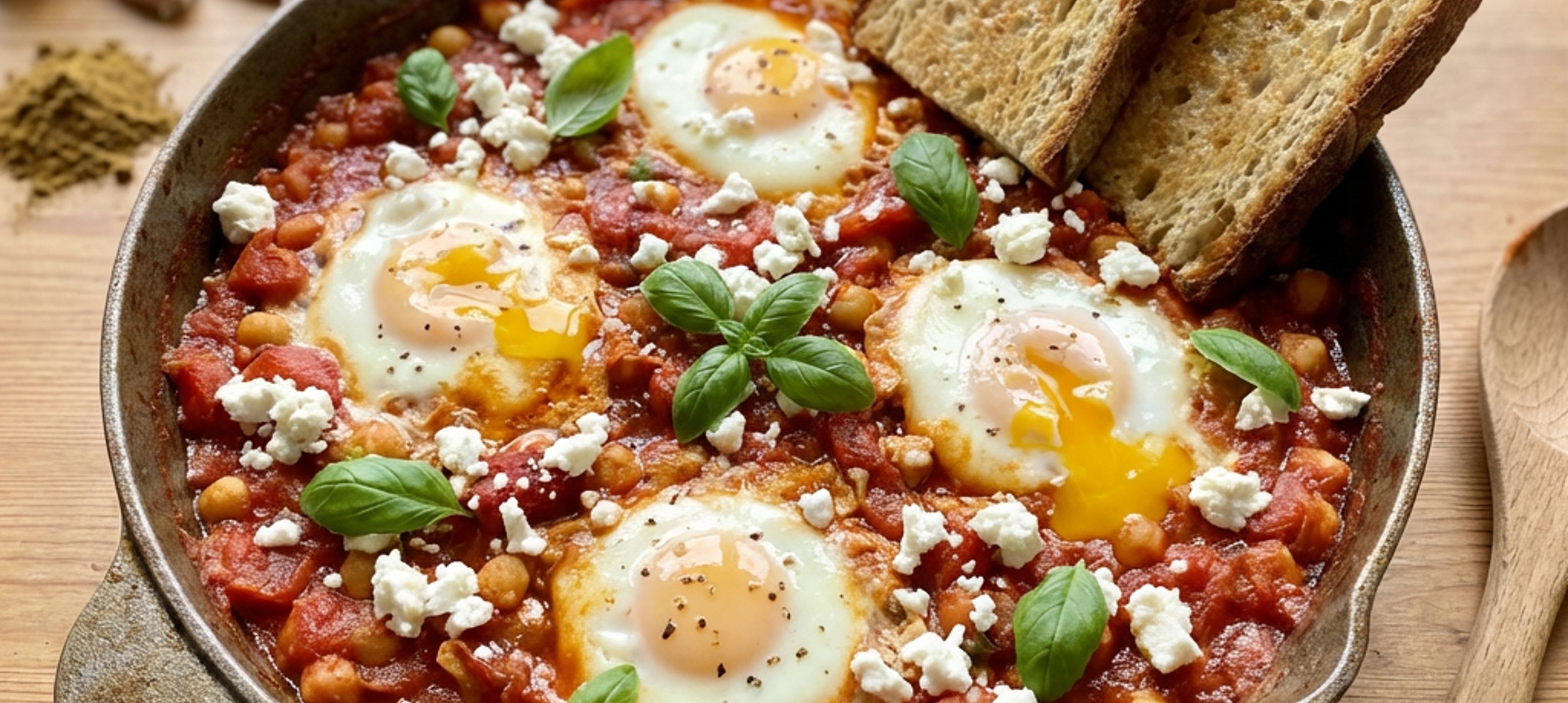 - 3Add the rinsed chickpeas, season with salt and pepper, then cook for a few more minutes. Make four small wells in the sauce and crack an egg into each.