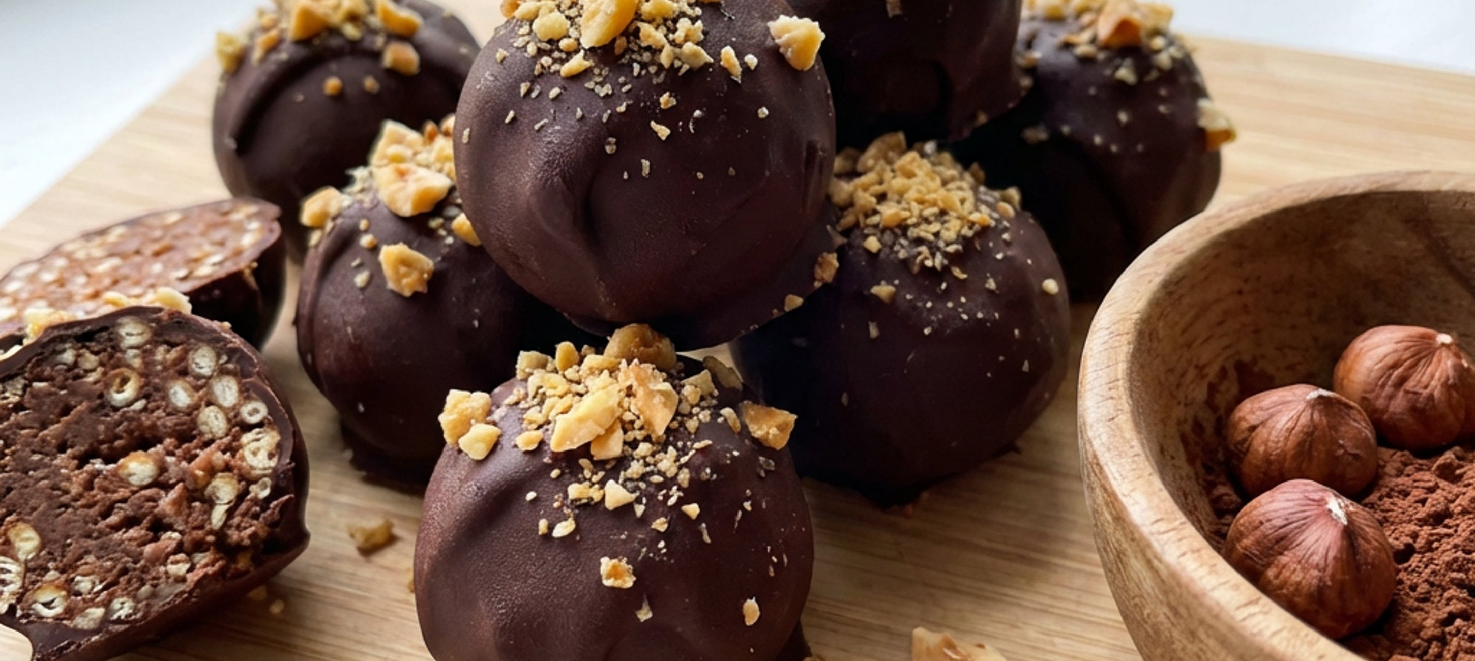 Dip the balls into melted dark chocolate, and sprinkle their tops with crushed peanuts.