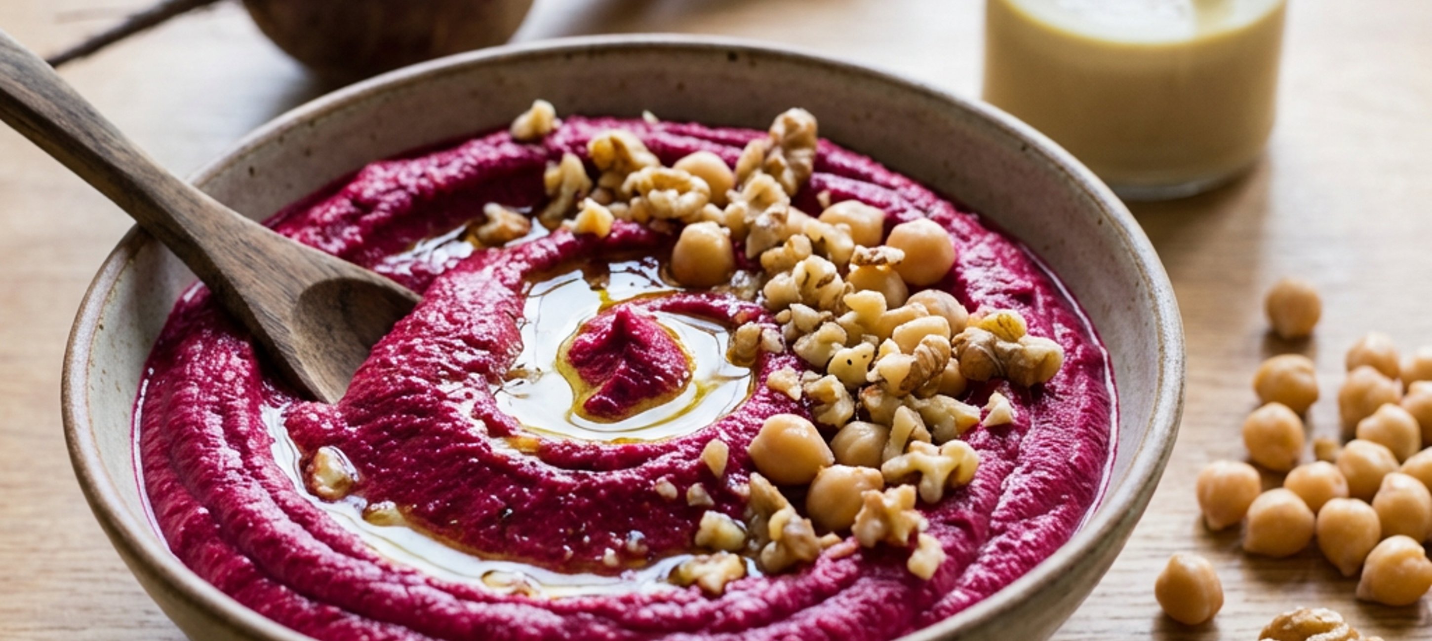 For preparation, place the cooked beetroot, drained chickpeas, tahini, lemon juice, salt, and pepper into a food processor (or high-speed blender). Begin blending the mixture.