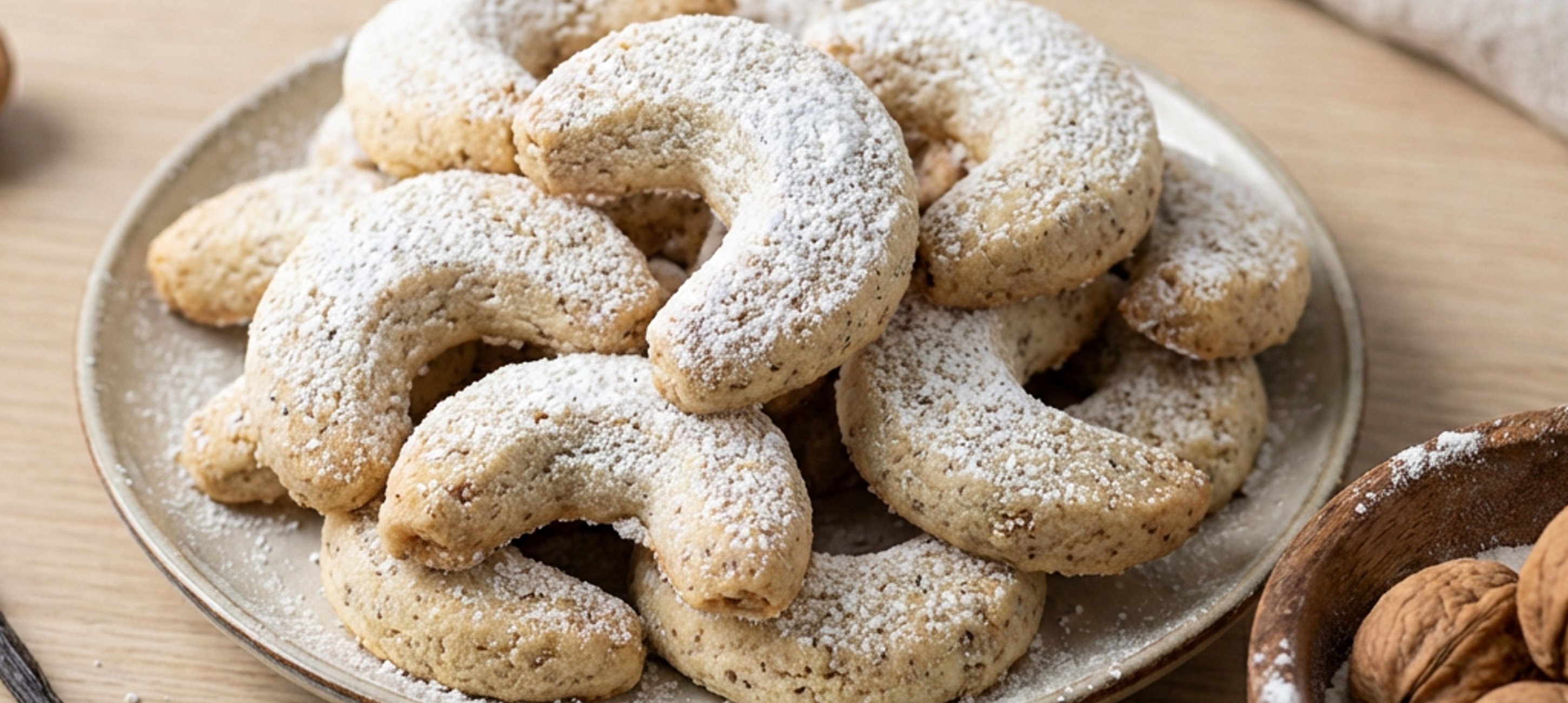 Finely grind the walnuts, then mix them with the powdered sugar, flour, vanilla, and salt.
