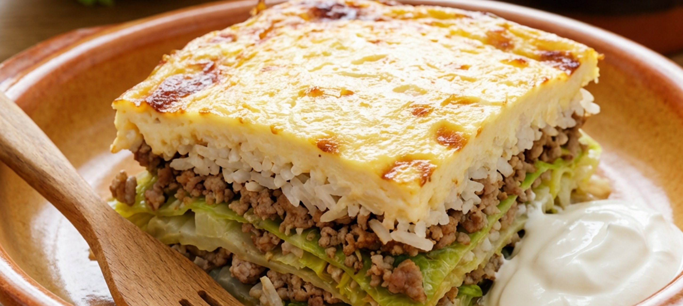 Spread half of the cabbage leaves on the bottom of a baking dish. Add the minced meat and rice mixture, then spread a little more than half of the sour cream mixture over it.