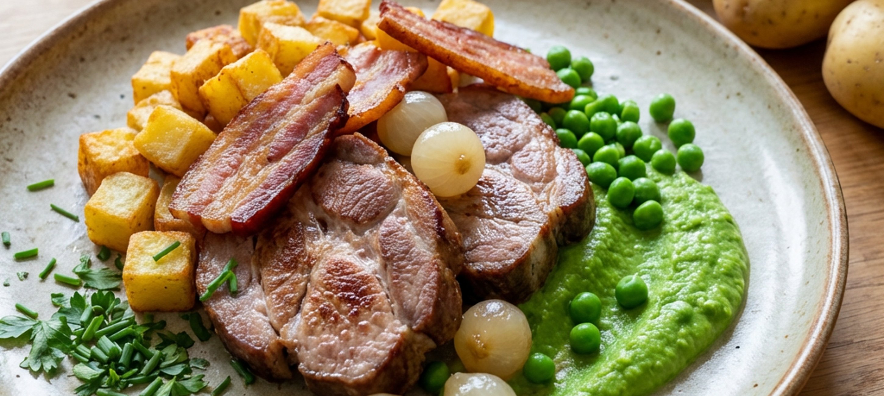 - 5Ha megpirultak, visszatesszük a szalonnát, beleforgatjuk a zsírban sült burgonyát és majorannával, frissen őrölt fekete borssal fűszerezzük, majd hozzáadjuk a tasakból leöntött levet. Majd a borsópürével és egész zöldborsóval tálaljuk. Megszórjuk zöldfűszerekkel, újhagymával.