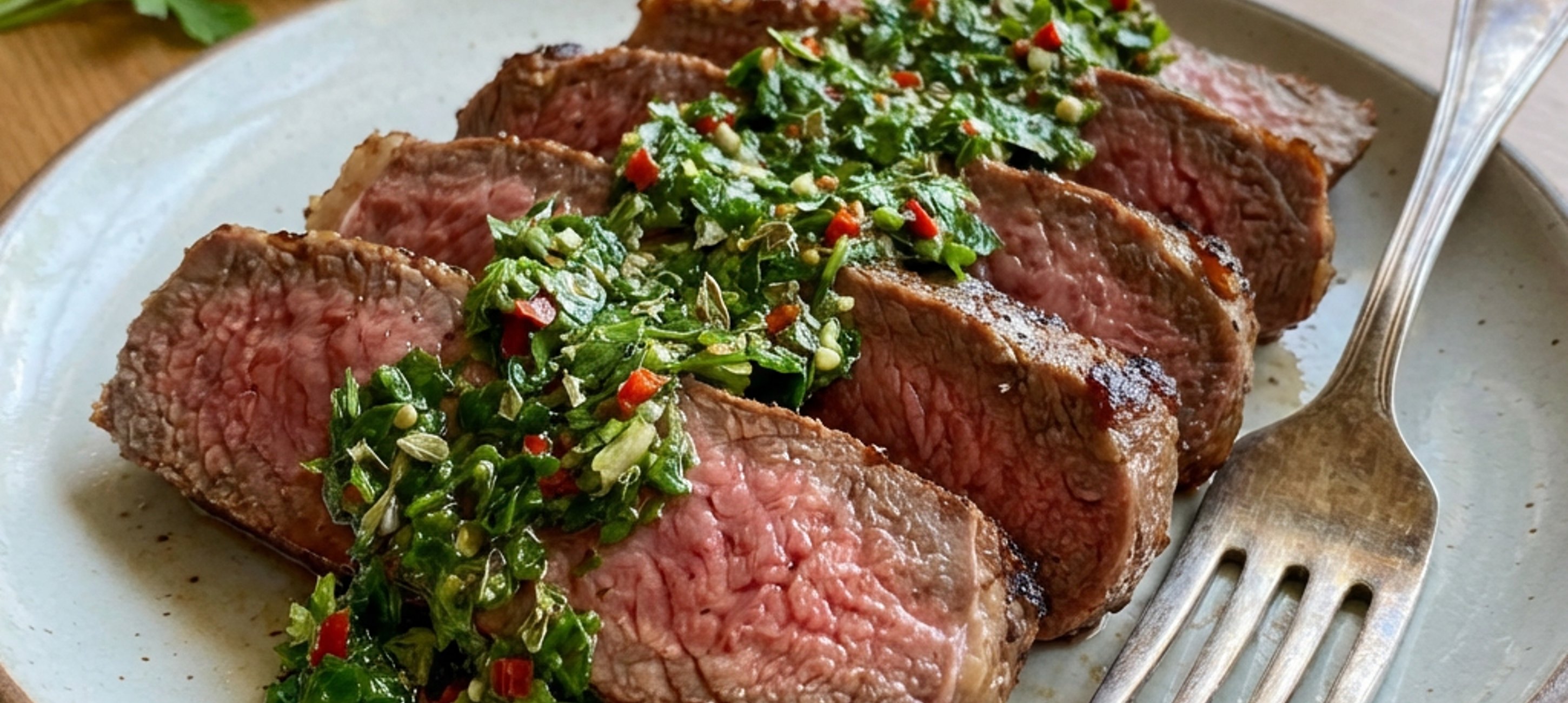 - 3Tálald a steaket a chimichurri mártással.
