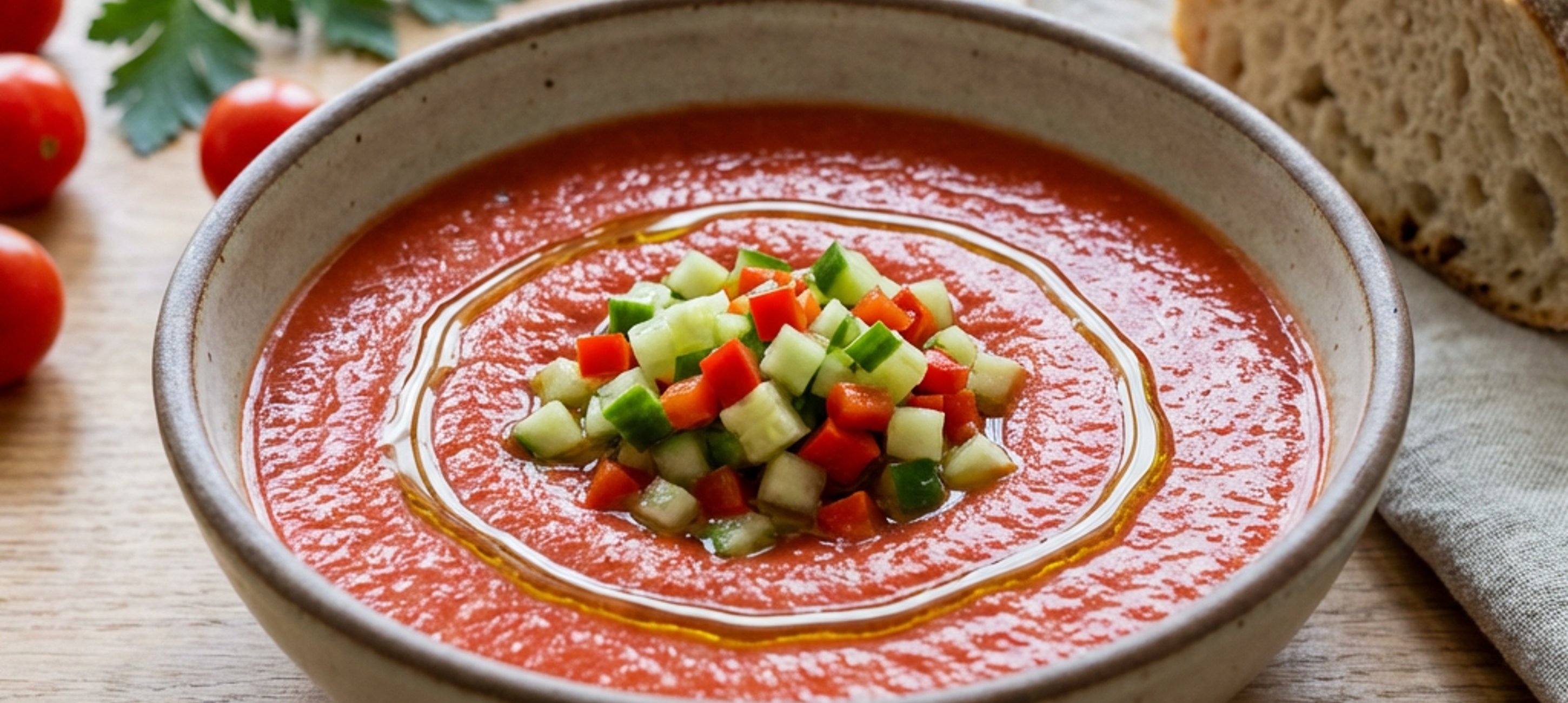 - 5A paradicsom hámozása nagyon egyszerű, ha kivágjuk a csumáját, bevágjuk a másik oldalát is kereszt alakban, és egy percre forrásban lévő vízbe, majd jeges vízbe dobjuk. A gazpacho gyümölcsökkel is elkészíthető, próbáljuk ki görögdinnyével, sárgadinnyével, eperrel is. A kenyér elhagyható, anélkül is kiváló, ráadásul nem hízlal és akkor gluténmentes is lesz.