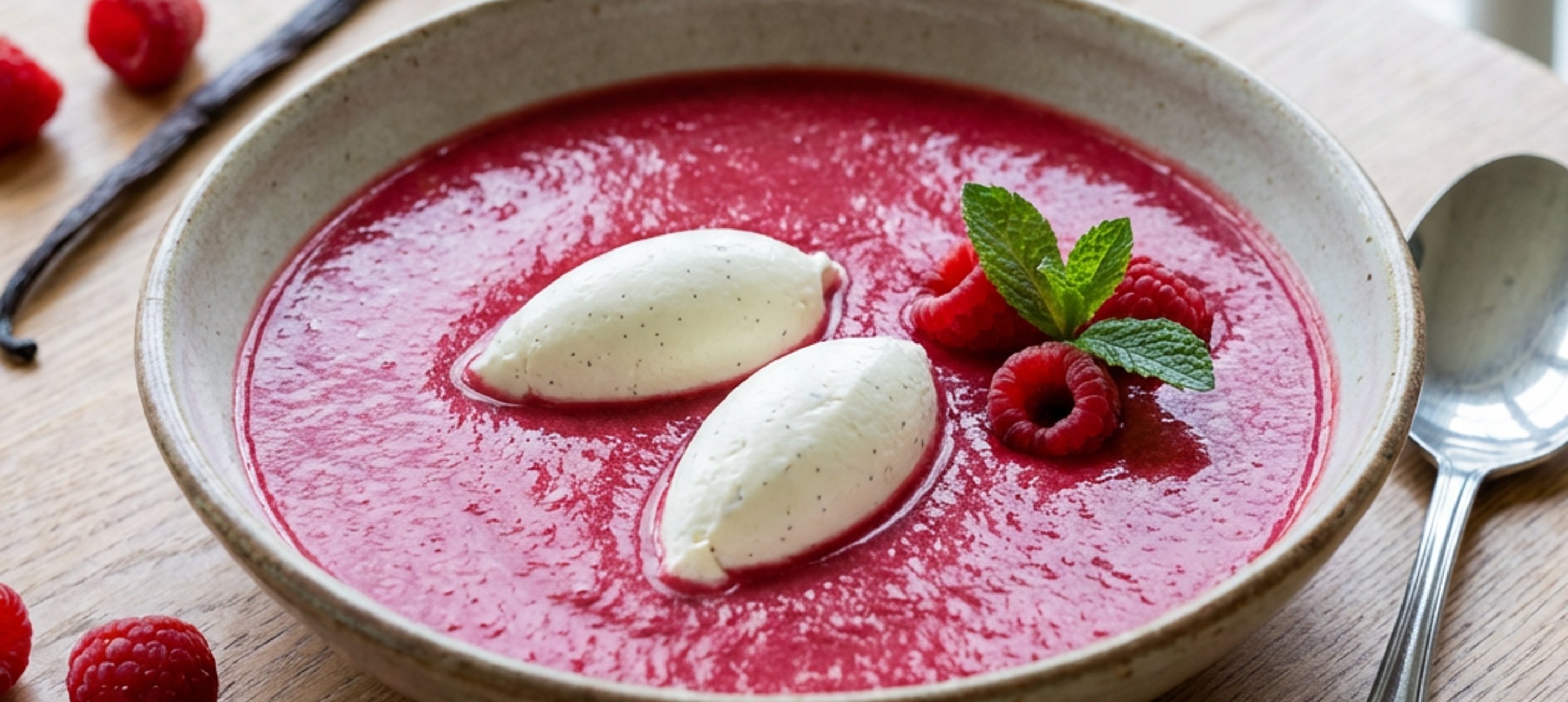 - 3A tányérba két kanállal “krémtúró” galuskákat formázunk és erre öntjük a jéghideg málnalevest.