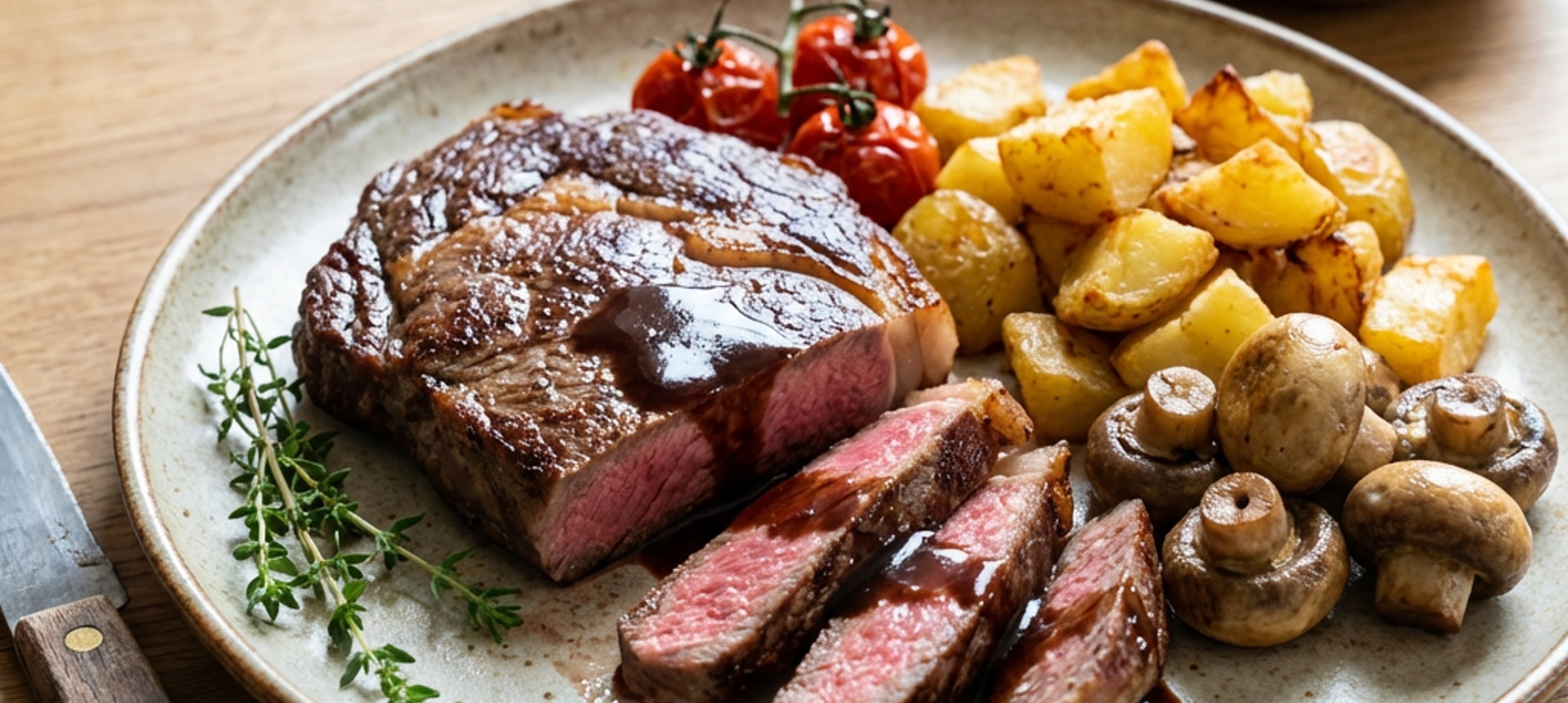 - 7Tálaljuk a pihentetett staeket a burgonyával, redukált alaplével, paradicsommal, gombával.