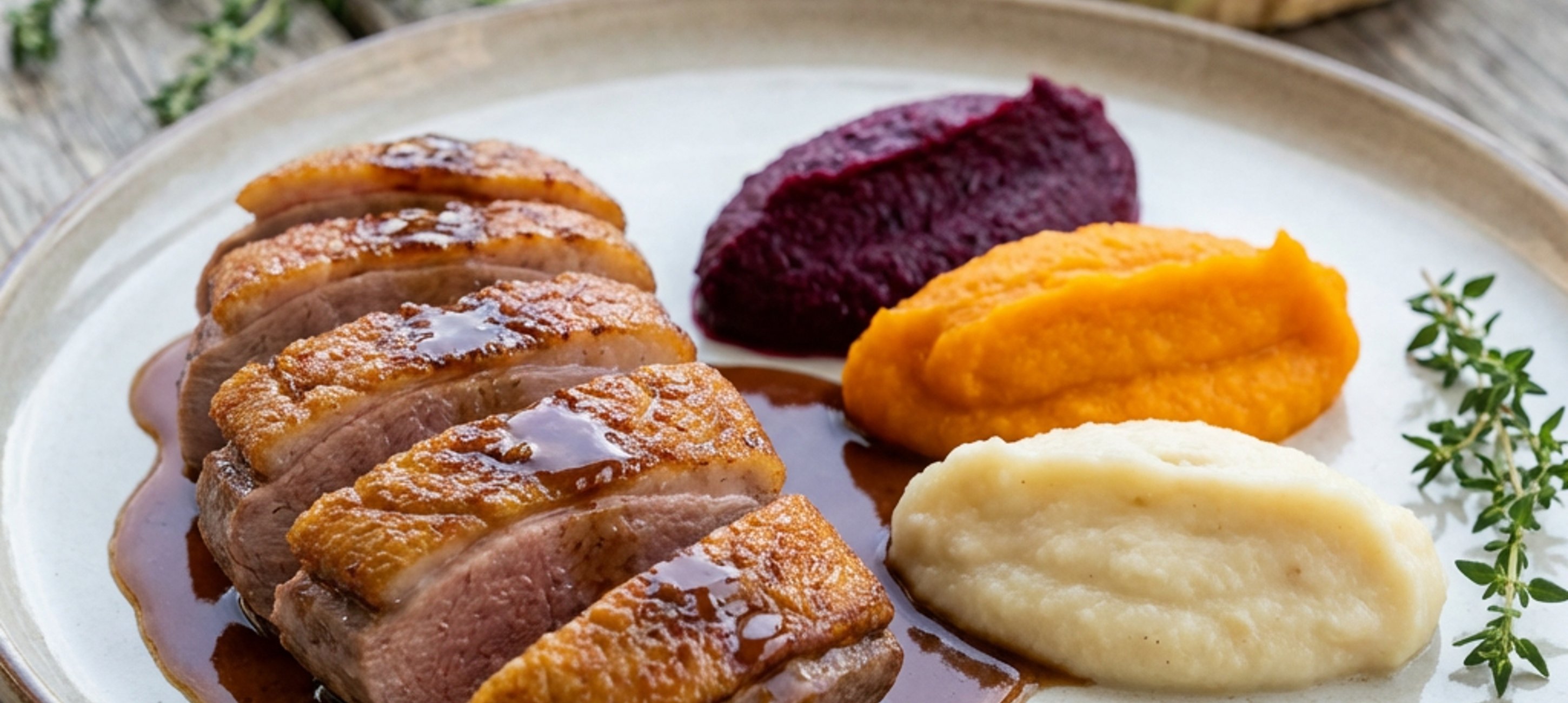 - 6Ha megsültek a kacsamellek, felvágás előtt pihentessük őket langyos helyen 10-15 percig, majd tálaljuk a háromféle pürével, szafttal és szép salátalevelekkel.