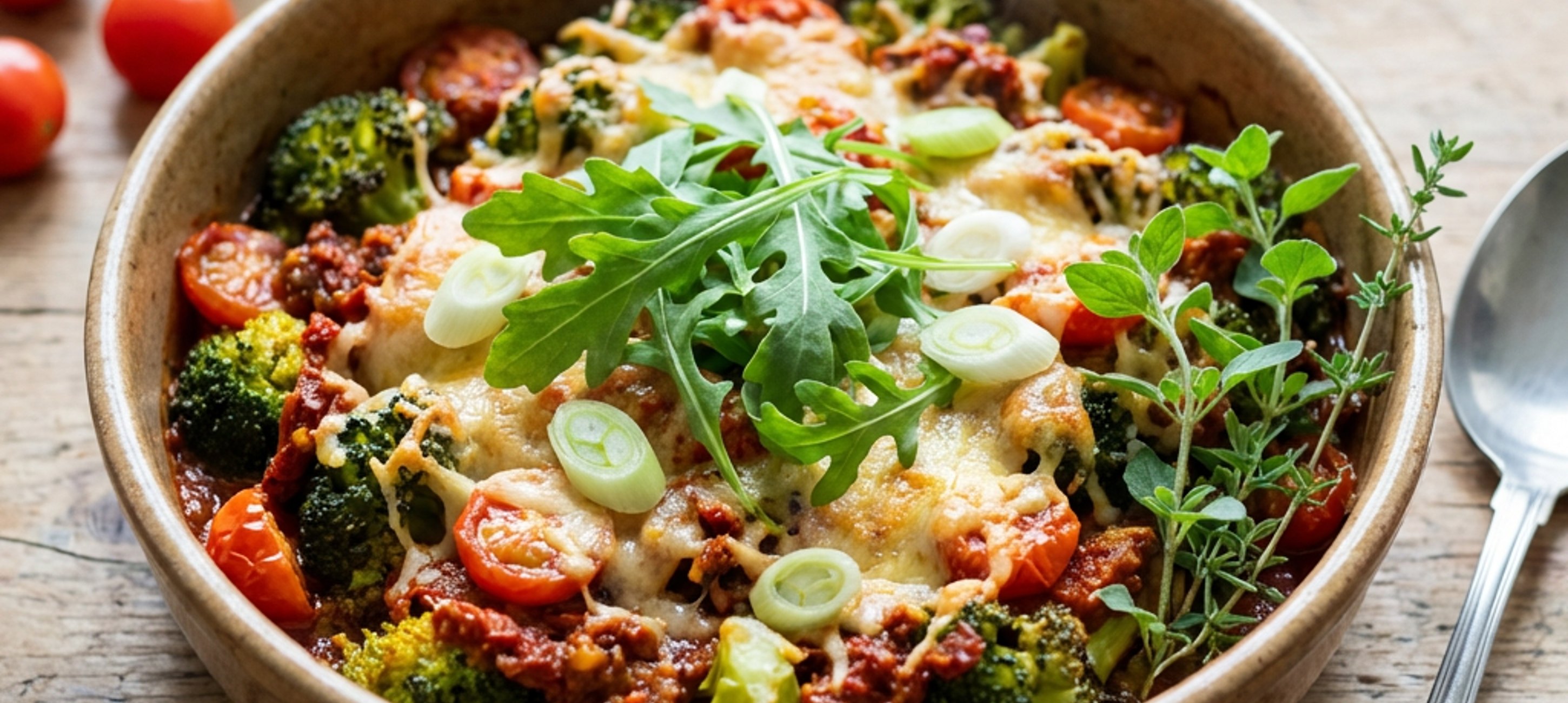 - 3Tegyünk a brokkoli mellé félbevágott koktélparadicsomokat is, és reszeljük rá a vegán sajtot is. Sózzuk ízlés szerint, majd tegyük az előmelegített sütőbe.