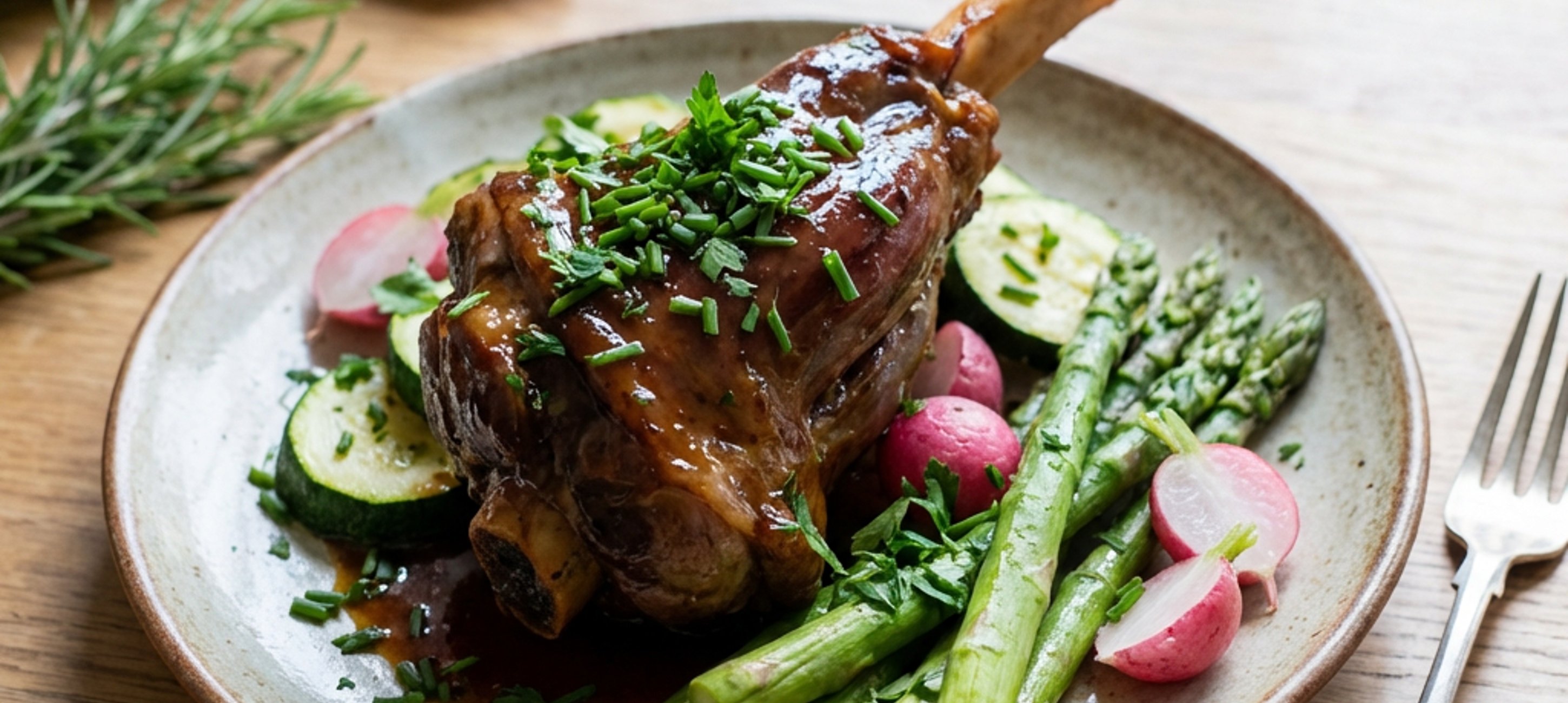 - 8Tálaljuk a csülköt a tavaszi zöldségekkel és a redukált szafttal.