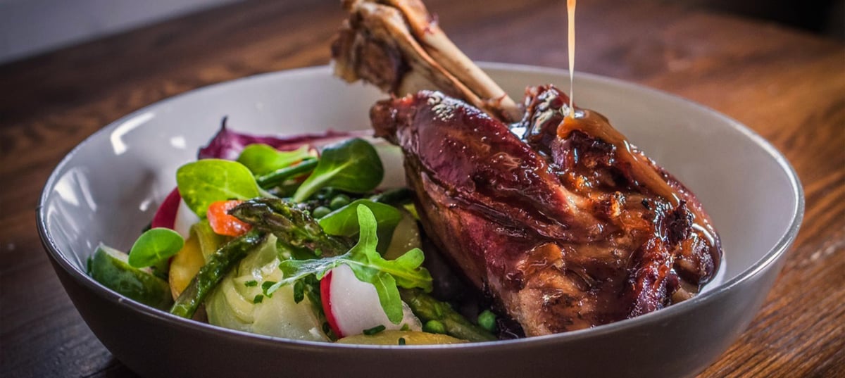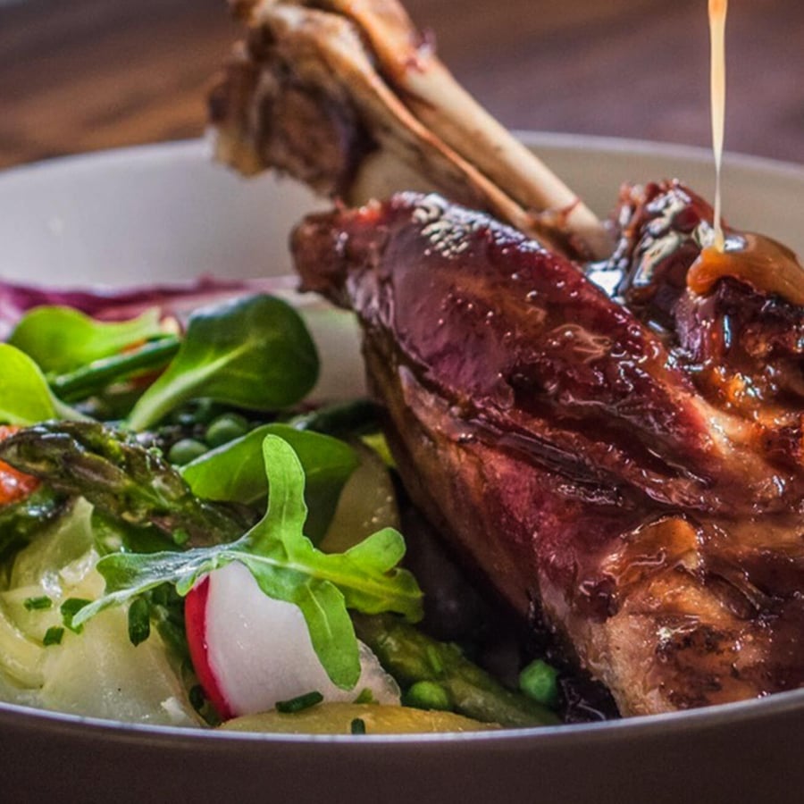 - 8Tálaljuk a csülköt a tavaszi zöldségekkel és a redukált szafttal.