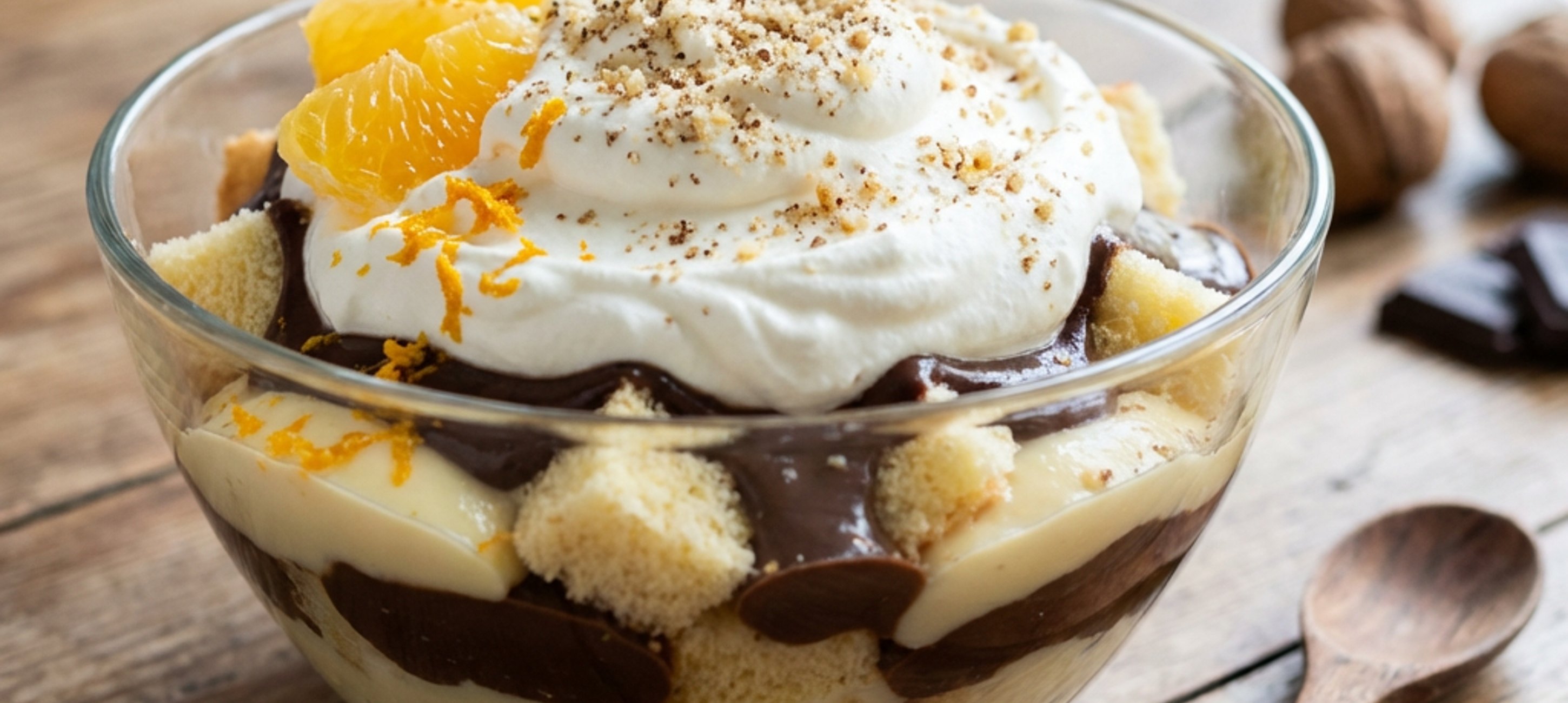 - 7A kihűtött piskótát vágjuk kb. 1,5 cm-es kis kockákra, majd rétegezzük egy nagyobb edénybe a krémekkel és a diós szórással. (Minden réteg krémre, és tetejére is kerüljön diós szórás.)