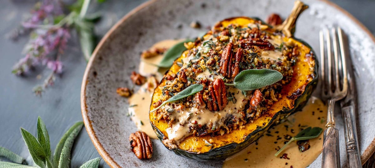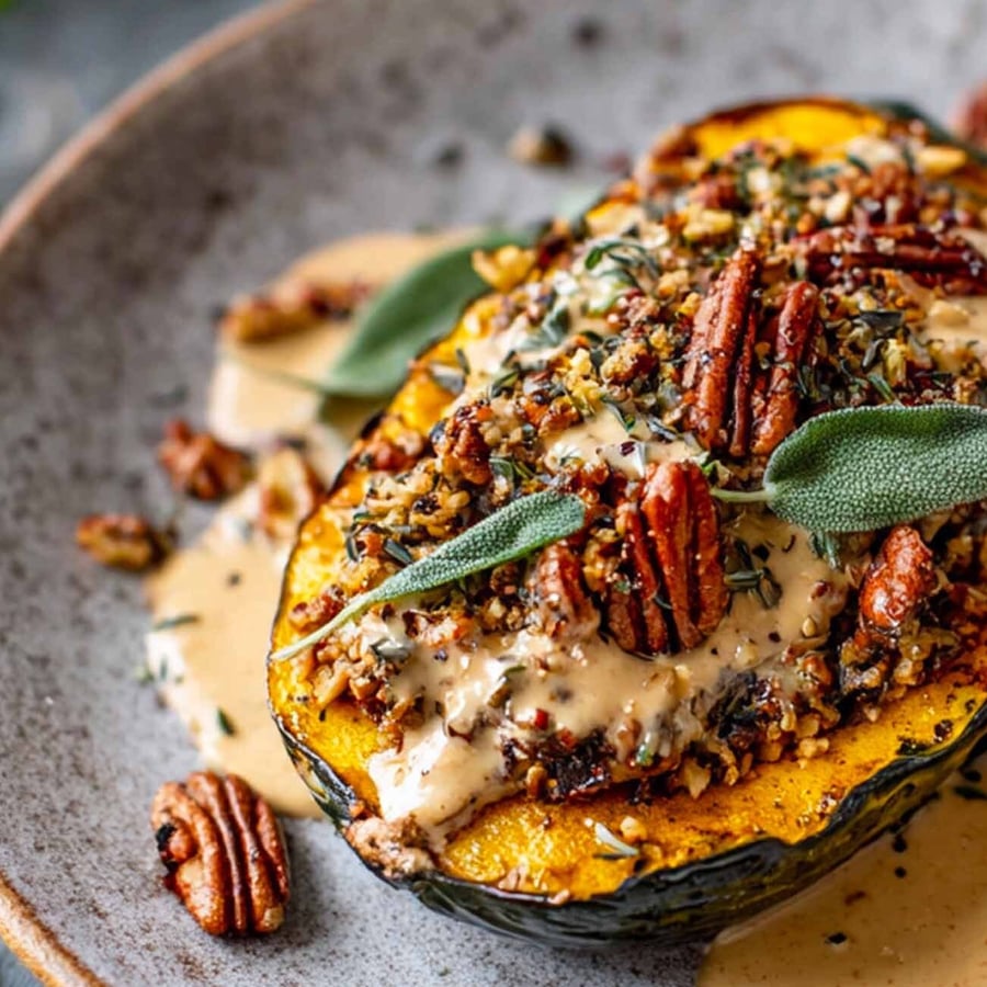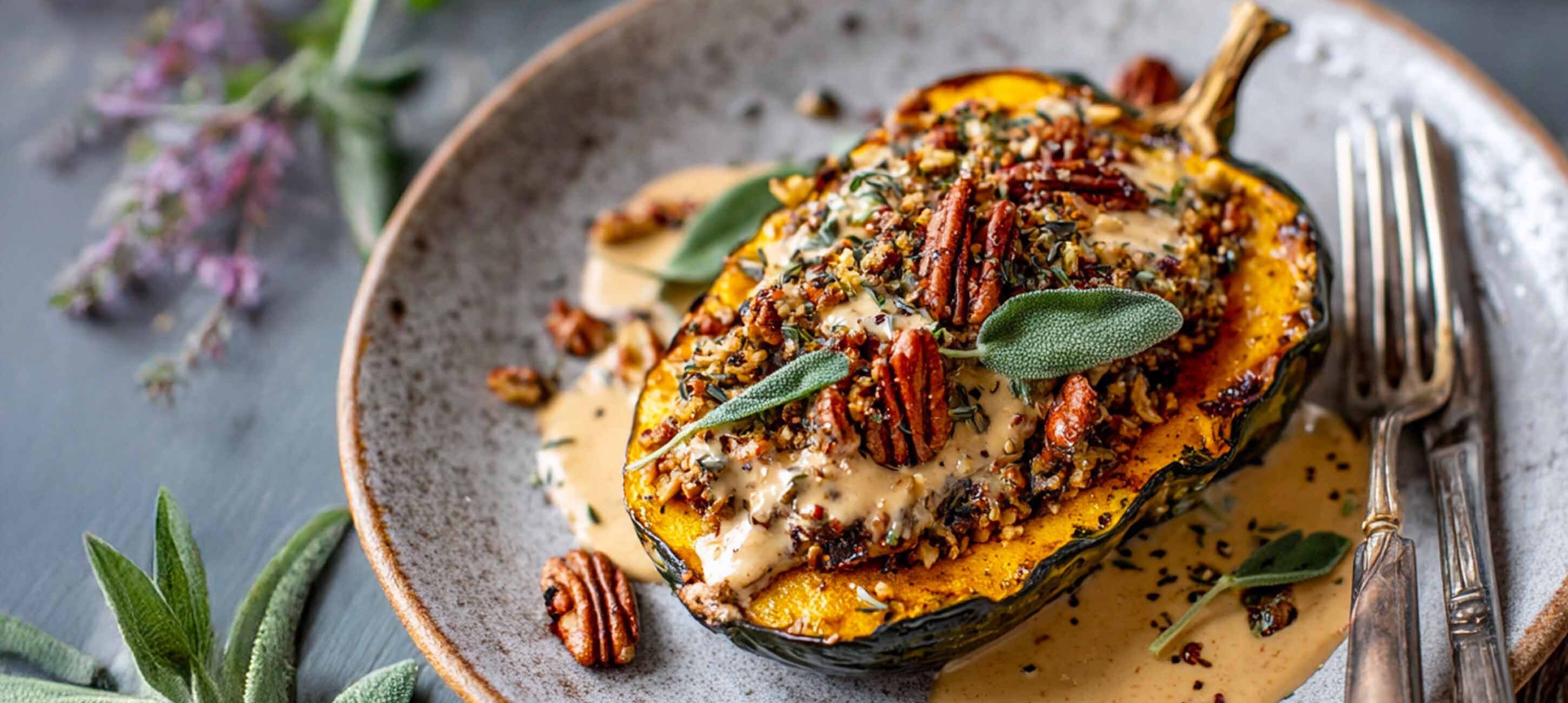 Tálalás: locsold meg a megtöltött sütőtököket a tahini-mártással és szórd a tetejére a ropogós zsályaleveleket. Jó étvágyat!