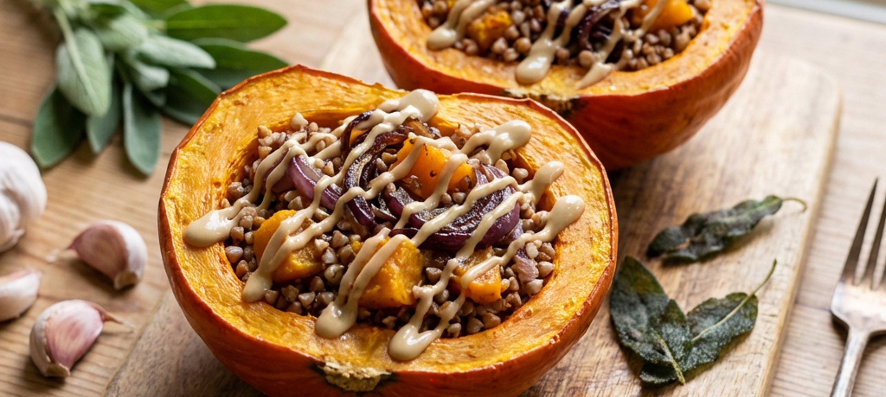 - 10Tálalás: locsold meg a megtöltött sütőtököket a tahini-mártással és szórd a tetejére a ropogós zsályaleveleket. Jó étvágyat!