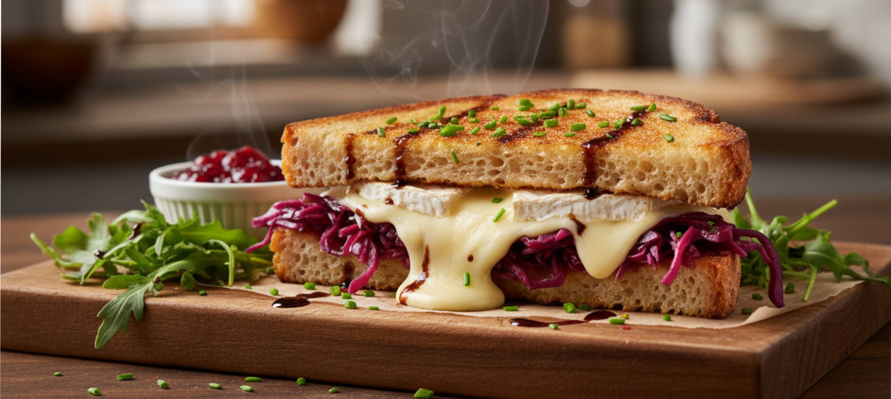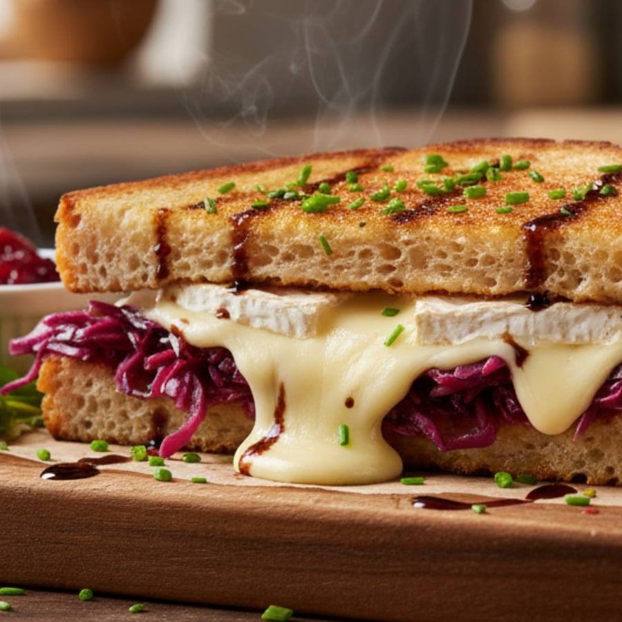 - 1Kenés és rétegezés: Kend meg a kenyérszeletek egyik oldalát dijoni mustárral. Erre halmozd a párolt vörös káposztát, majd szeleteld rá a camembert sajtot. Fedd le a másik szelettel.