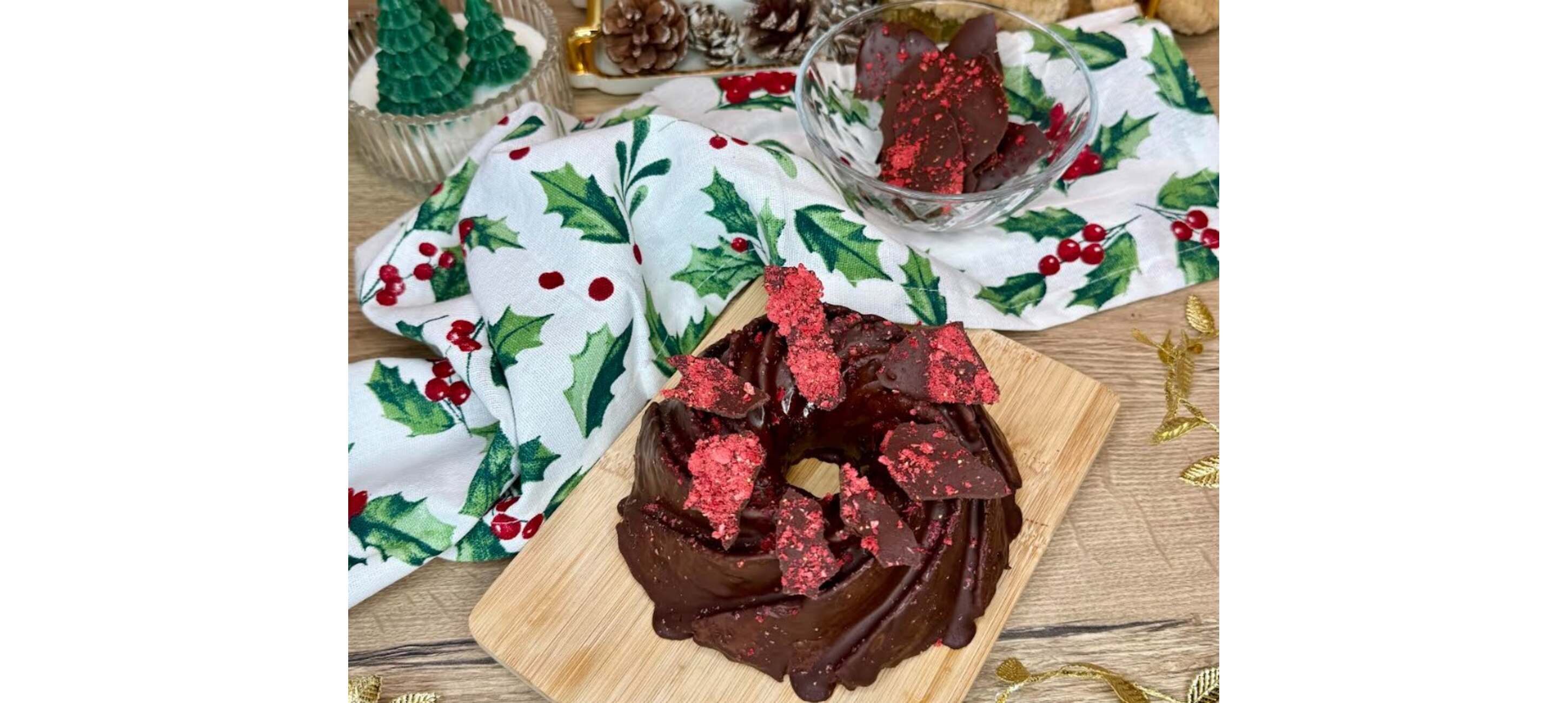 - 4A csorgatásból megmaradó étcsokoládét egy sütőpapírral elterítjük, megszórjuk liofilizált eperporral, majd ezt is a fagyasztóba tesszük, hogy teljesen megszilárduljon. Ez a ropogós, eperporos csokilap tökéletes díszítés lesz a kuglóf tetejére, vagy más desszertekhez is használhatjuk.
