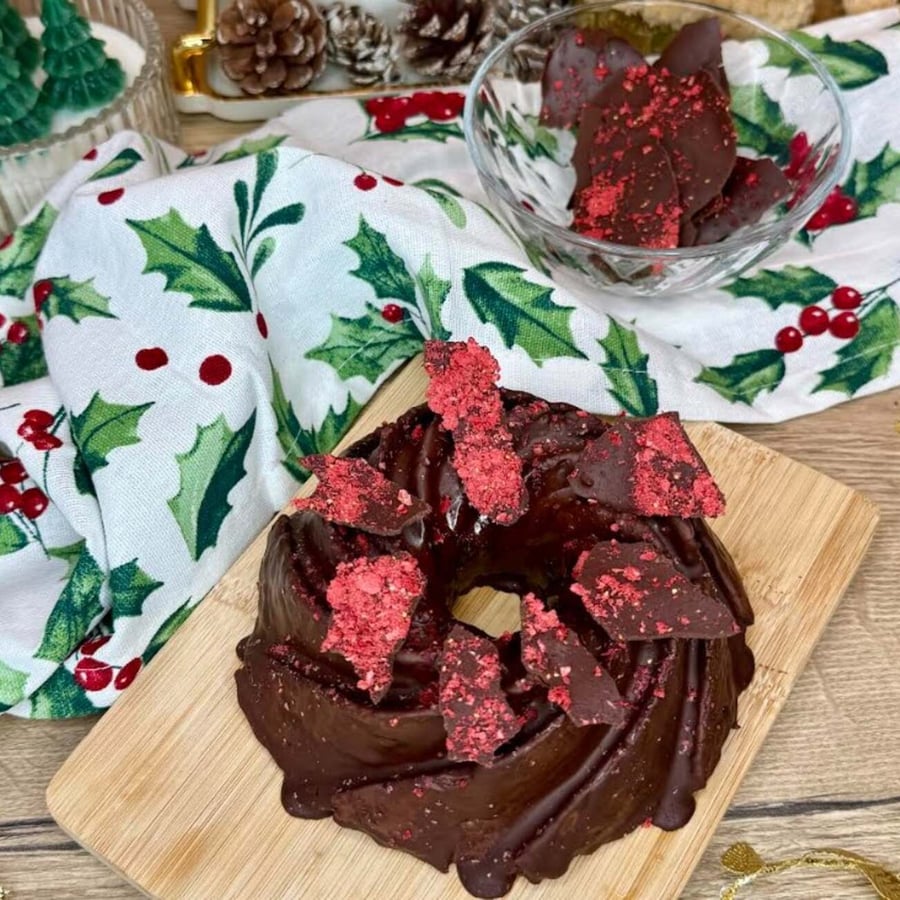 - 3Miután teljesen kihűlt, fejjel lefelé óvatosan kifordítjuk a formából.Közben az étcsokoládét mikróban felolvasztjuk, majd hagyjuk visszahűlni annyira, hogy még folyékony legyen, de ne forró. A csokoládét a kuglófra öntjük, egyenletesen eloszlatjuk rajta, és megszórjuk liofilizált eperporral. Ezután a kuglófot a fagyasztóba tesszük, hogy a csokoládé szépen megdermedjen.