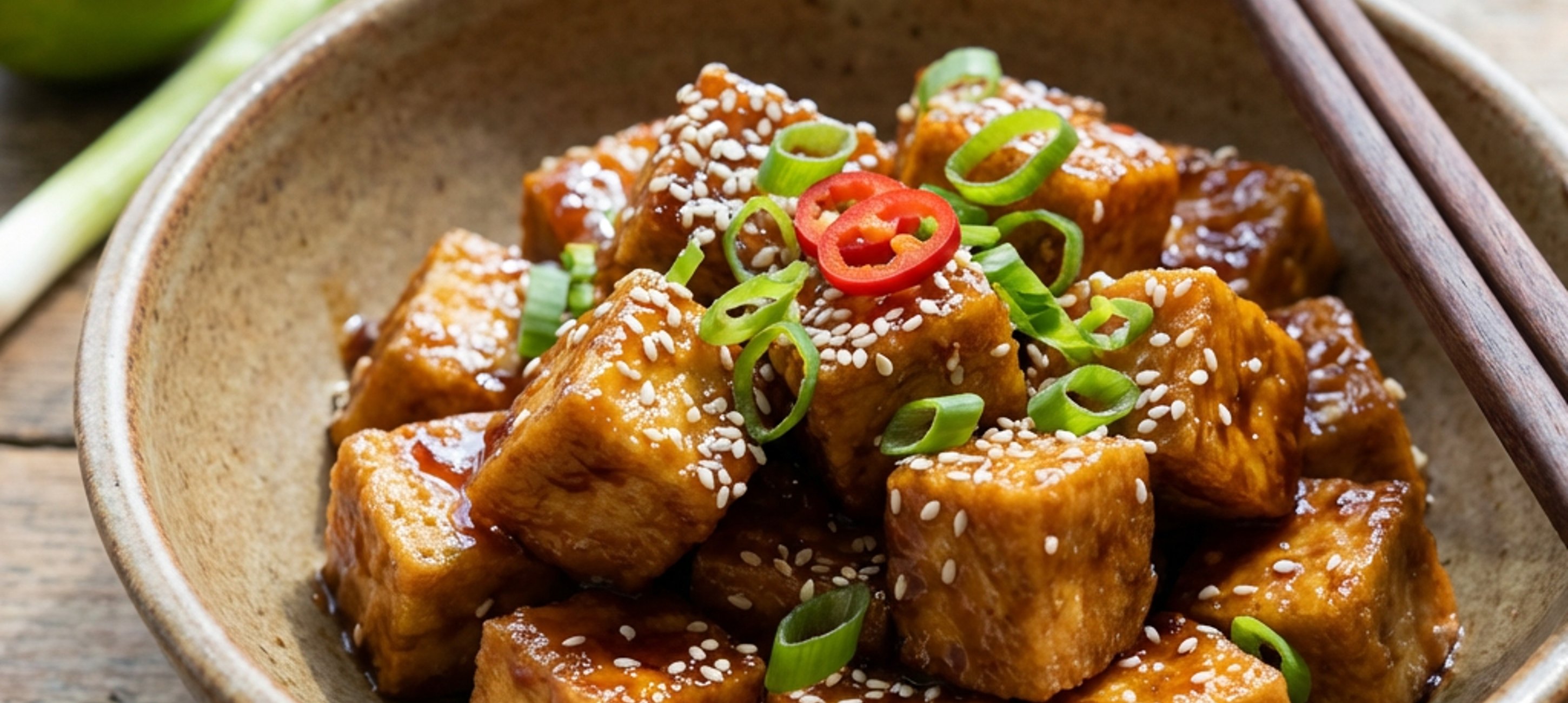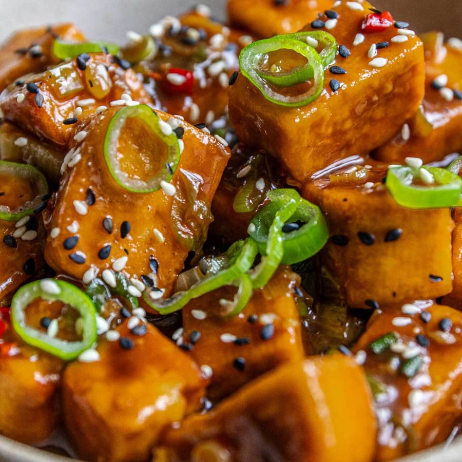 - 4Zárás: Ha a tofu tökéletesen megpirult, vedd ki a serpenyőből, és tedd bele az apróra vágott újhagymát. Pirítsd pár percig, majd tedd vissza a ropogós tofut. Végül öntsd rá a szószt, és forrald 1 percig, amíg besűrűsödik és bevonja a tofut.