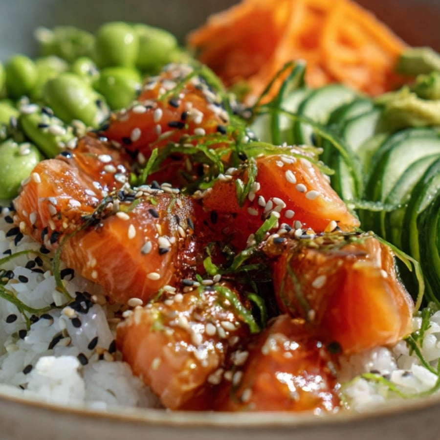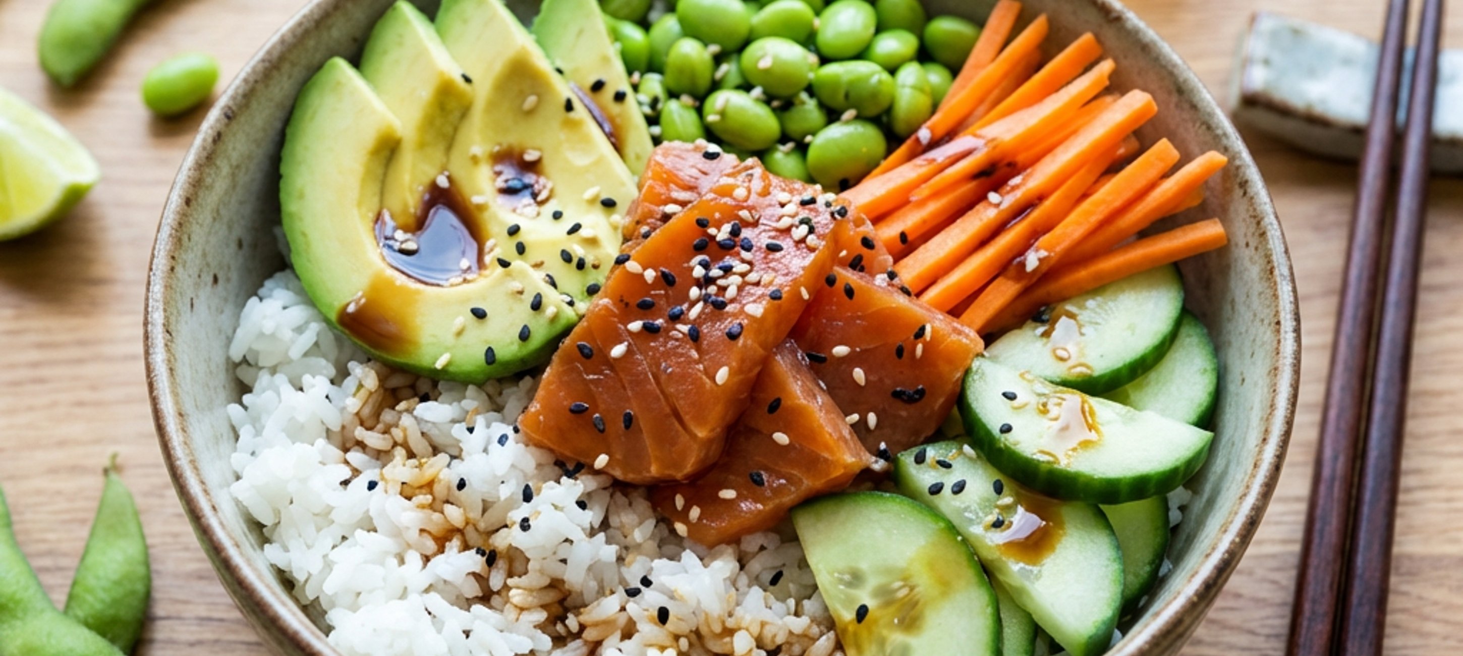 - 5A rizst osszuk két tálba. Rendezzük rá a pácolt „lazacot”, a zöldségeket és az edamame‑t.
