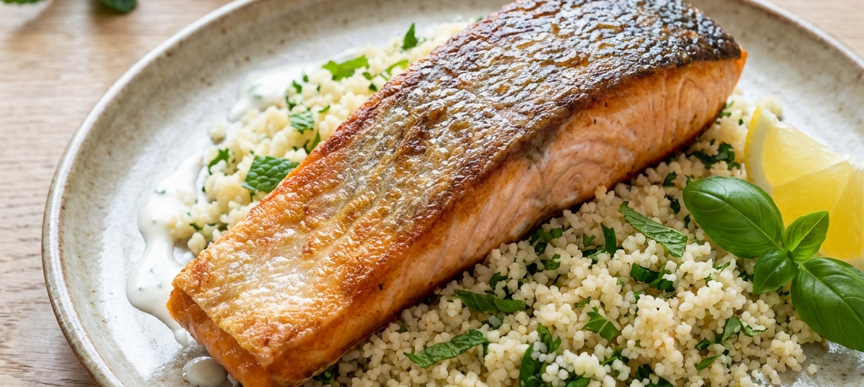 - 3Helyezd a lazacfiléket a kuszkuszra bőrös felükkel felfelé, tedd a sütőtálat az előmelegített sütőbe, és süsd 15-17 percig.