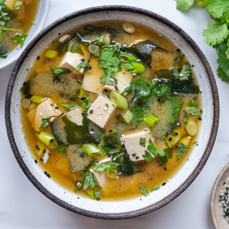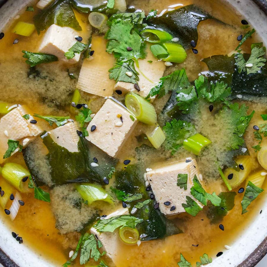 - 3Add a felkockázott tofut, az újhagymát és a szójaszószt a forrásban lévő vízhez, és főzd további 5 percig, majd alaposan keverd bele a miso pasztát.