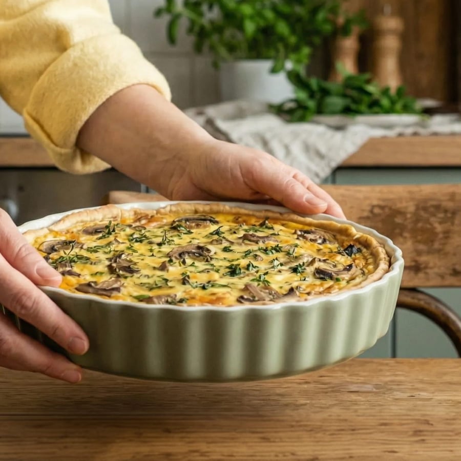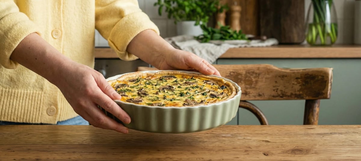 - 7Öntsük a tojásos keveréket a tésztaformába. Osszuk el rajta egyenletesen a párolt gombát és medvehagymát. A tetejét díszítsük az egész gombákkal, a maradék medvehagymával és a felkockázott brie sajttal.