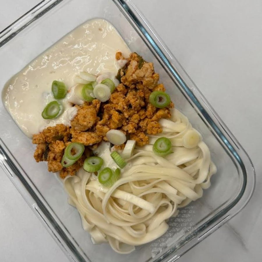 - 5A tésztát forrón a darált hússal és a krémes tofuval tálaljuk. Tetejére kerülhet apróra vágott újhagyma.