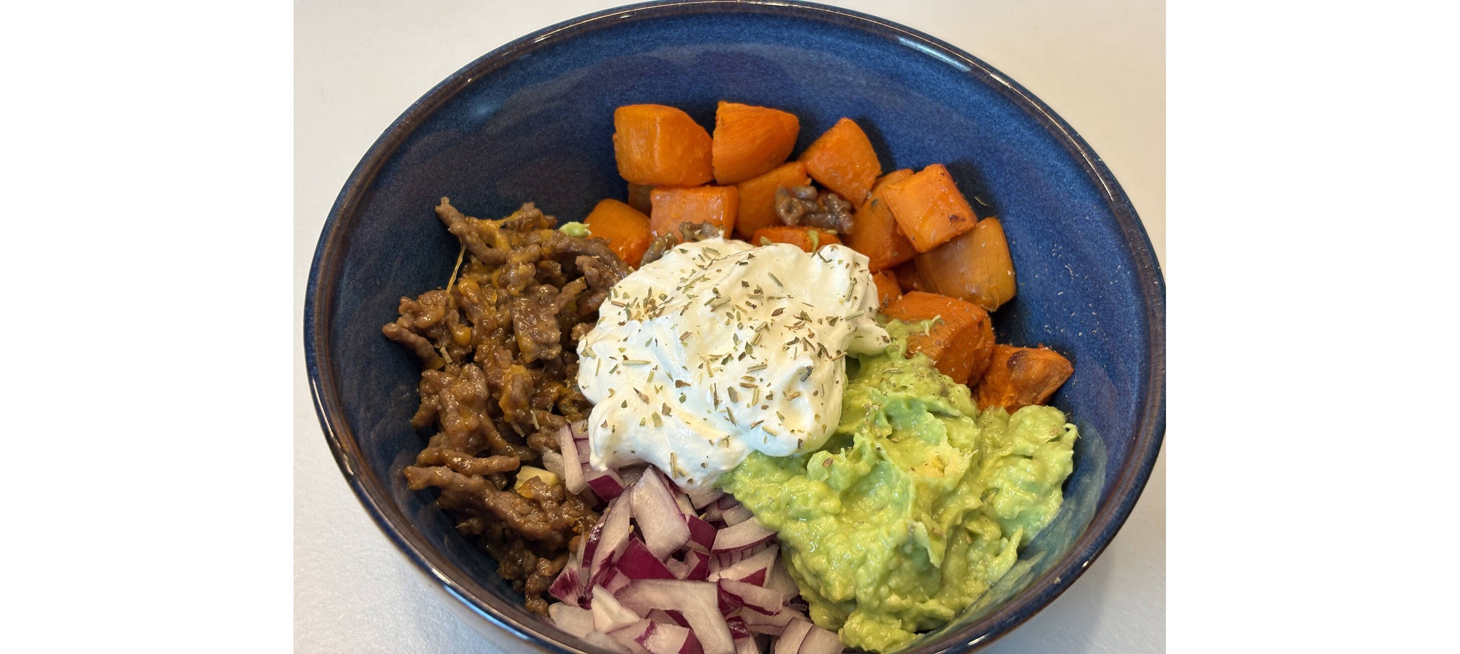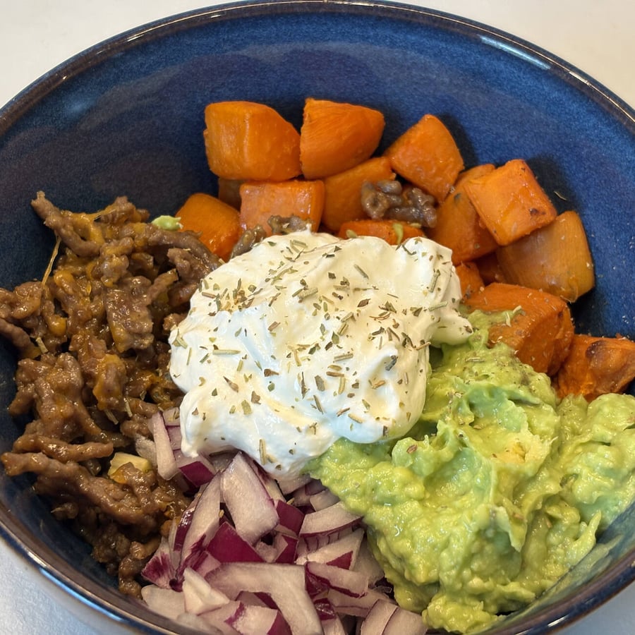 - 6Tálalás: tegyél egy kevés édesburgonyát, avokadókrémet, lilahagymát, marhahúst a tálba, persze szépen negyedeld el a tányéron. A tetejére mehet kb. 1 ek tejföl, szórd meg zöld fűszerkeverékkel végül csurgass rá egy kevés mézet az ízrobbanás érdekében!