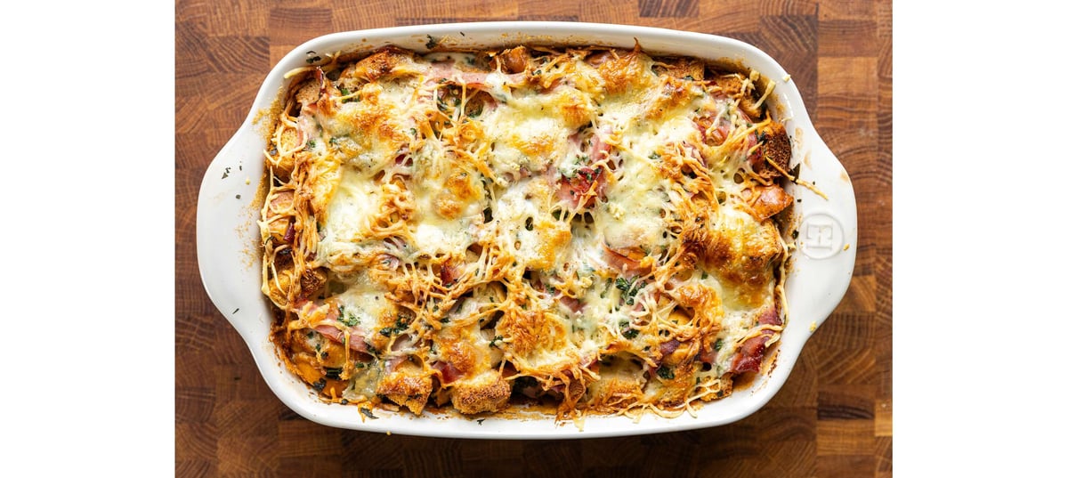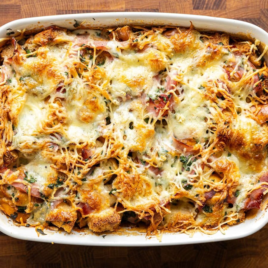 - 4A pirított pékáru felét helyezzük a forma aljára, szórjuk rá a sonka és a petrezselyem felét. Tépkedjük rá a mozzarella felét, és szórjuk meg a reszelt ementáli felével is. Ismételjük meg a rétegezést a maradék hozzávalókkal.