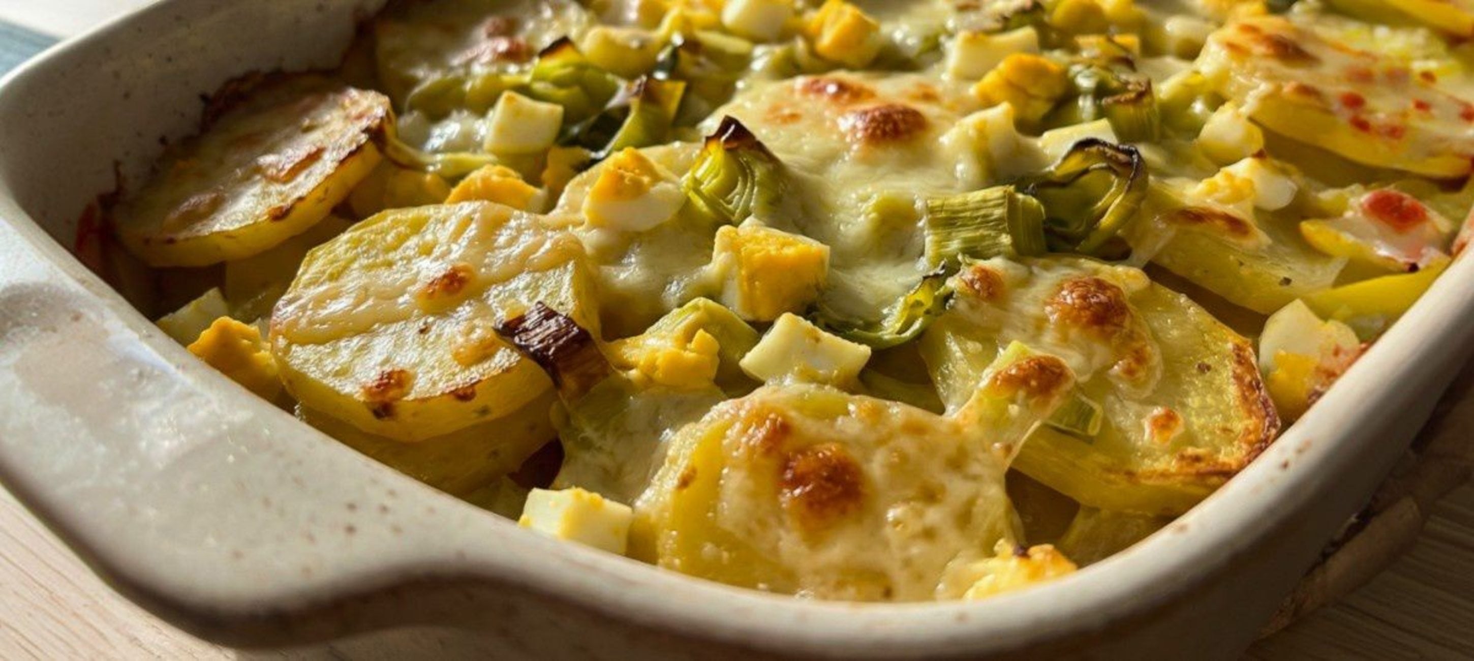 - 3Rétegezzük a burgonyát, a póréhagymát és a tojást a sütőformába. Minden réteget enyhén sózzunk és borsozzunk meg.