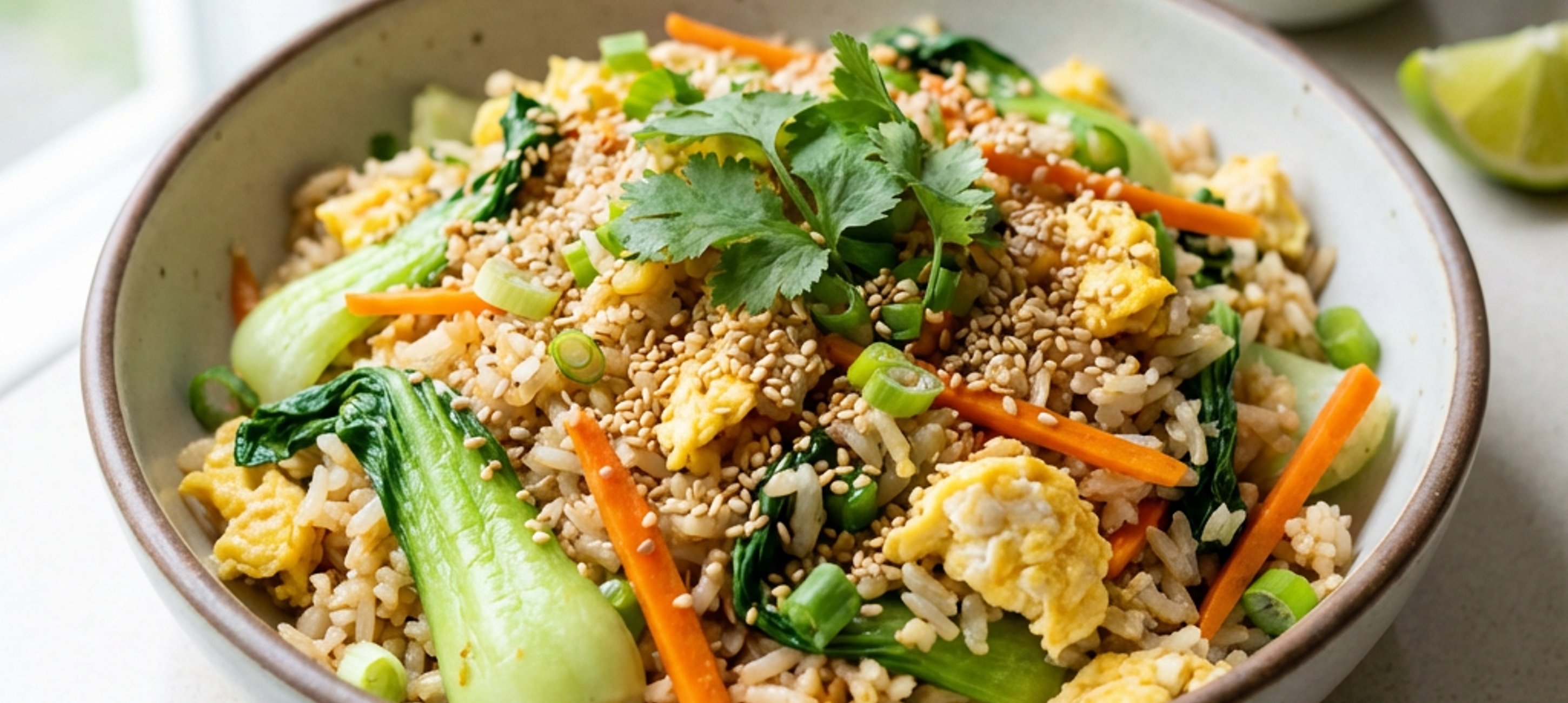 - 3A sárgarépát, a pak choit és az újhagymát a végén add hozzá, és pirítsd további 2 percig. Ízesítsd sóval és borssal. A sült rizst tálaláskor díszítsd szezámmaggal és friss korianderrel.