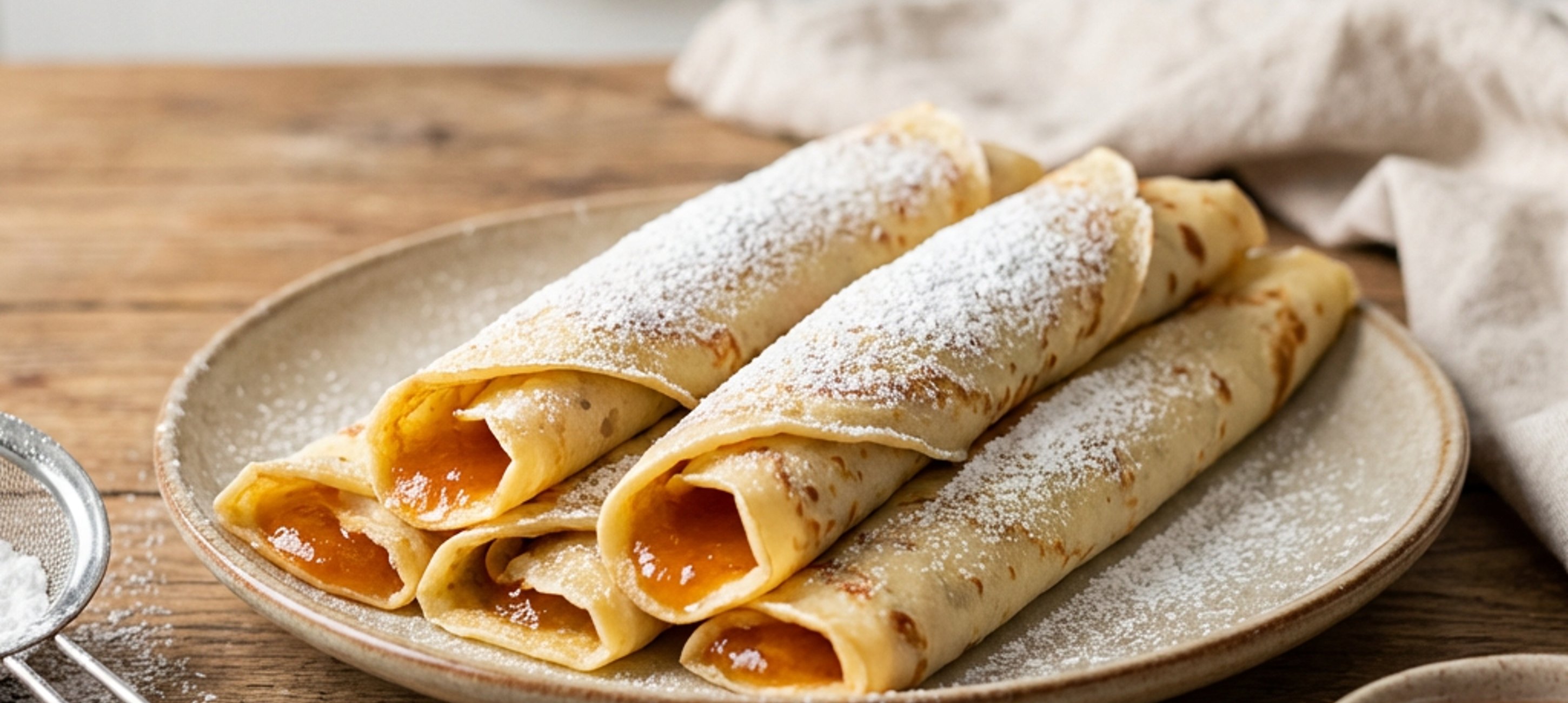 - 3A kész palacsintákat tegyük tányérra, kenjük meg lekvárral, tekerjük fel, és a tetejét szórjuk meg porcukorral.