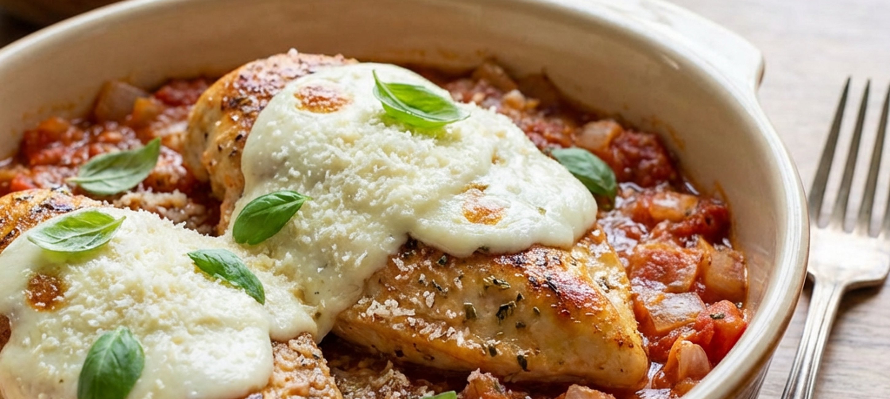 - 4A kész paradicsomos szószt öntsük a tepsibe. Helyezzük rá az elősütött csirkemelleket, tegyük rájuk a mozzarella szeleteket, és szórjuk meg az egészet reszelt parmezánnal. Tegyük a tepsit az előmelegített sütőbe, és süssük 13–15 percig 200–210 °C-on.