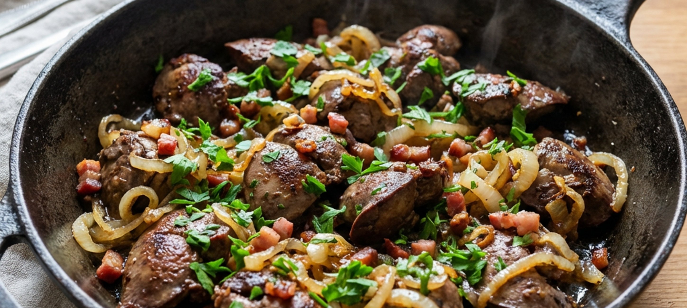 - 1A szalonnát vágd 1 cm-es kockákra. A vöröshagymát tisztítsd meg és aprítsd fel finomra. A csirkemájat tisztítsd meg a hártyáktól, papírtörlővel alaposan szárítsd meg, majd forgasd meg a lisztben. A felesleges lisztet rázd le róla.
