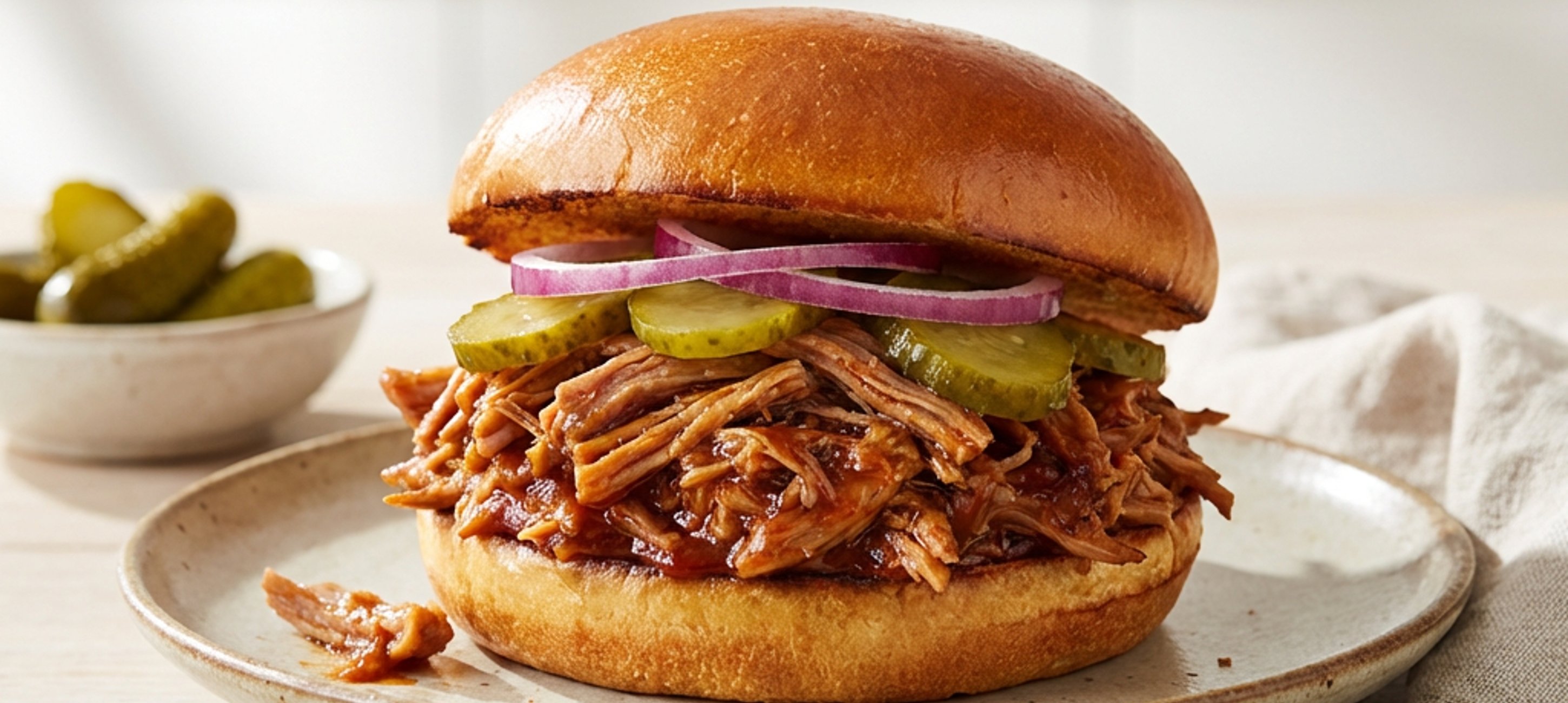 - 6A zsemléket vágjuk ketté, kenjük meg mustárral, majd halmozzuk rájuk a tépett húst, a szeletelt uborkát és a hagymát.