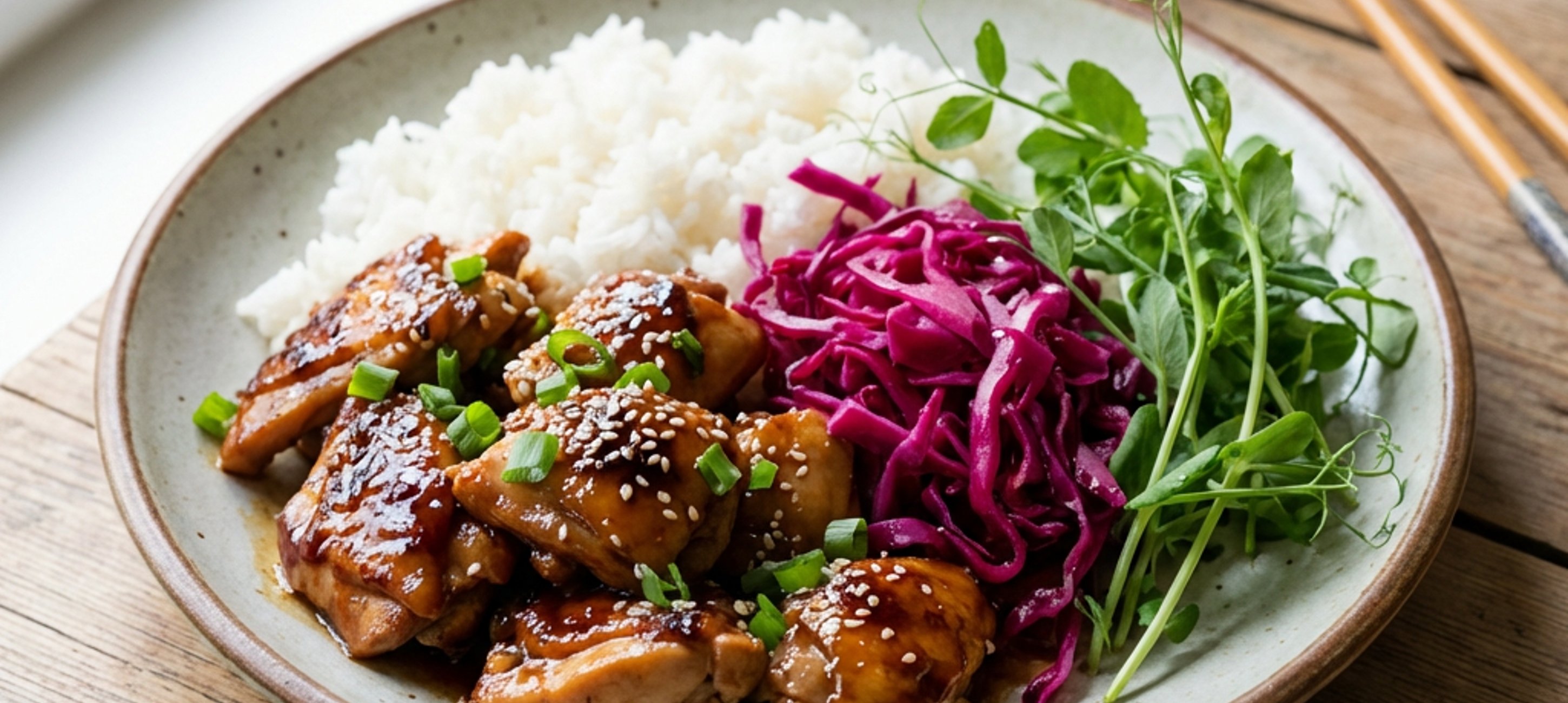 - 3Egy tálkában keverjük össze a teriyaki szószt, a szójaszószt, a narancslevet és az étkezési keményítőt. Amikor a hús átsült, öntsük rá a mártást, és alacsony lángon főzzük, amíg be nem sűrűsödik. Tálaljuk szezámmaggal megszórva, főtt rizzsel, a savanyított hagymával és friss borsóhajtással díszítve.