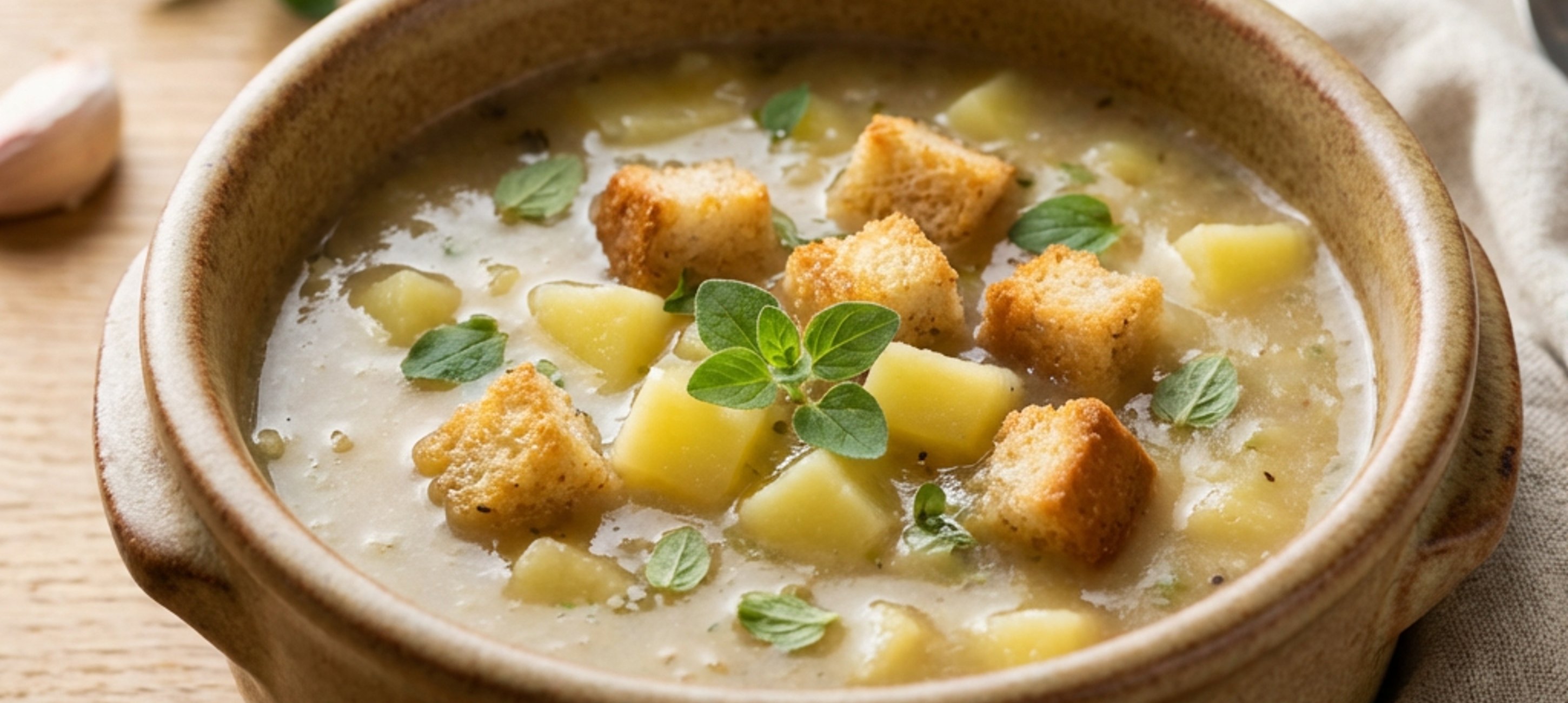 - 4Ízesítsük sóval, borssal és a morzsolt majorannával. Alacsony lángon főzzük körülbelül 20 percig, amíg a burgonya teljesen megpuhul. Tálaláskor szórjunk a tetejére ropogós kenyérkrutont.