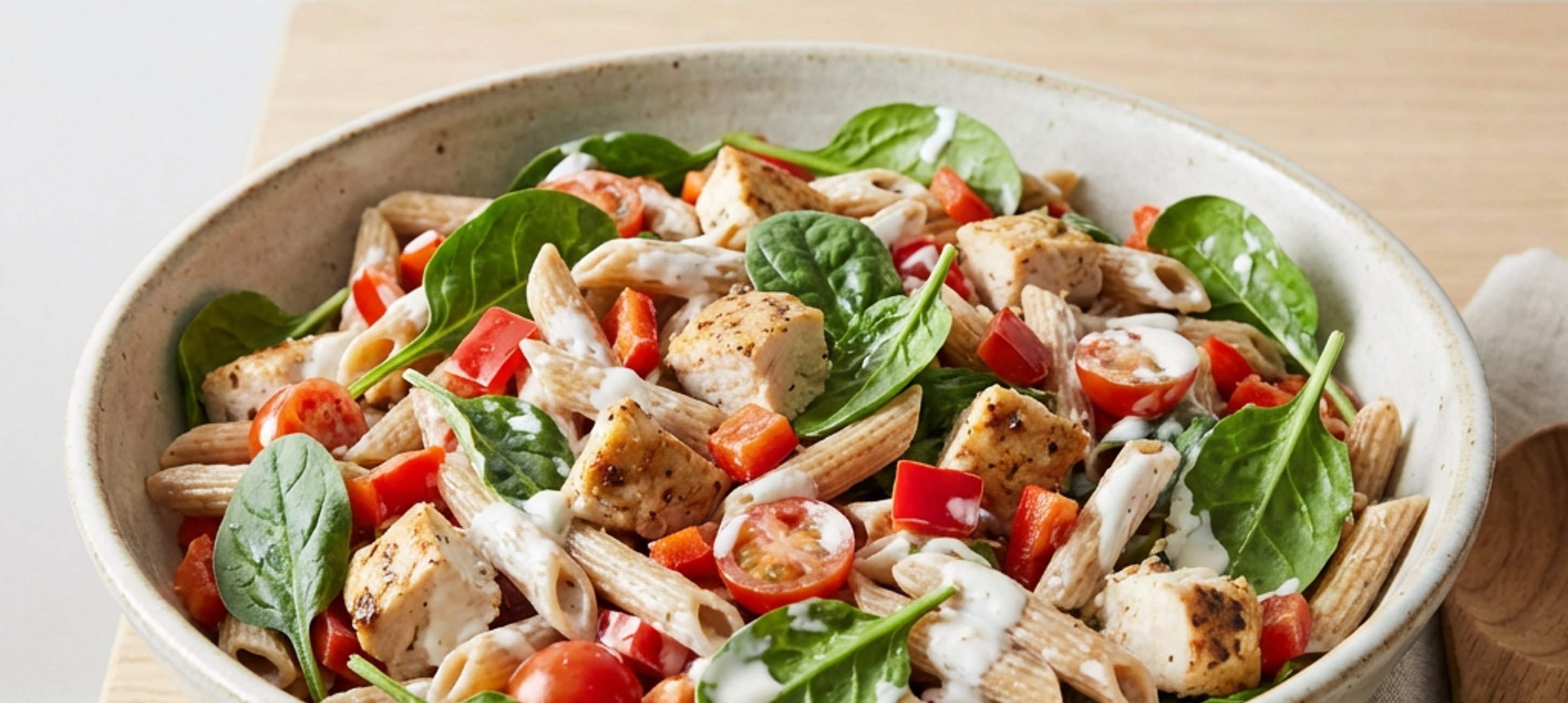 - 5Egy nagy salátástálban forgasd össze a főtt tésztát, a sült csirkét, a felaprított paprikát, a felezett paradicsomokat, a friss bébispenótot és a joghurtos öntetet. Ízlés szerint sózd és borsozd még, ha szükséges.