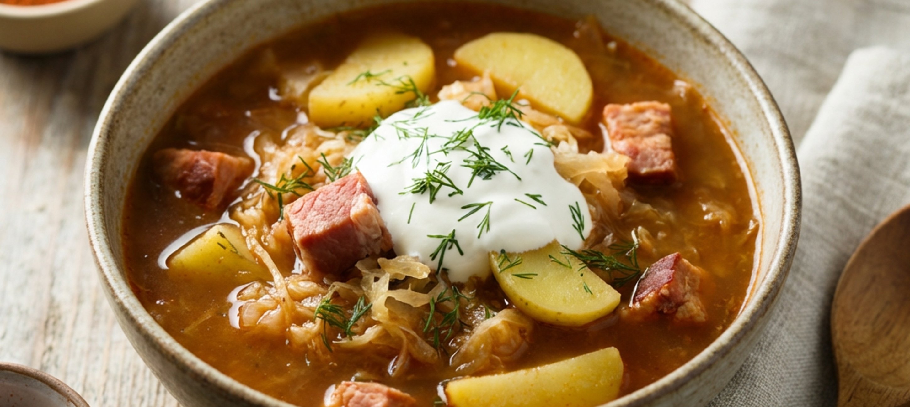 - 2A savanyú káposztát nyomkodjuk ki (a levét tegyük félre), vágjuk durvára, majd adjuk a leveshez a káposztalé harmadával együtt. Adjuk hozzá a babérleveleket és az 1 cm-es kockákra vágott burgonyát. Lassú tűzön főzzük 15 percig. Ezután adjuk hozzá a burgonyával megegyező méretűre kockázott füstölt húst, és főzzük további 5 percig. Távolítsuk el a babérleveleket, majd ízesítsük sóval, borssal, és szükség szerint cukorral vagy a félretett káposztalével. Tálaláskor adjunk hozzá egy kanál tejfölt.