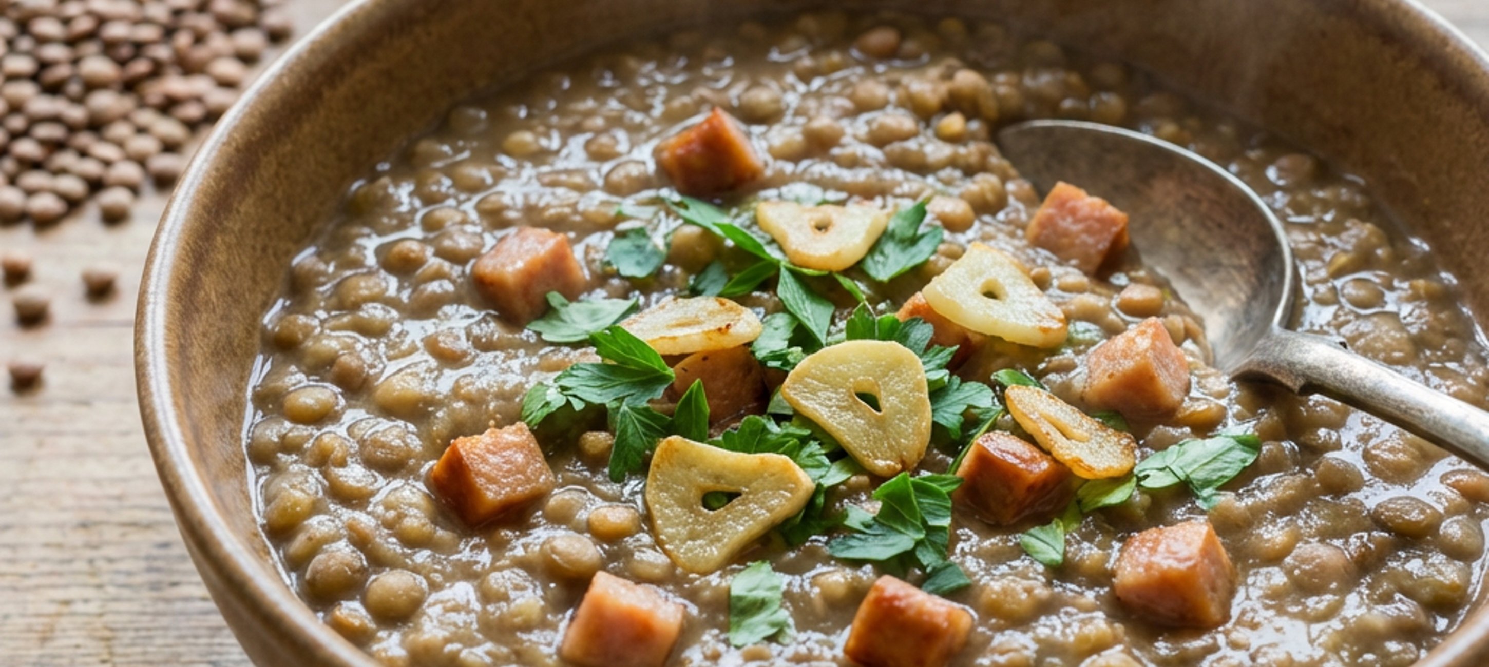 - 5Tipp: A fokhagymát ne pirítsuk túl, mert megkeseredhet. A pürésített lencse természetes módon sűríti be a levest, így nincs szükség rántásra, és a fogás gluténmentes marad. Vegetáriánus változathoz használjunk zöldség alaplevet, a kolbászt pedig hagyjuk el. Az elkészítéshez botmixerre lesz szükség.