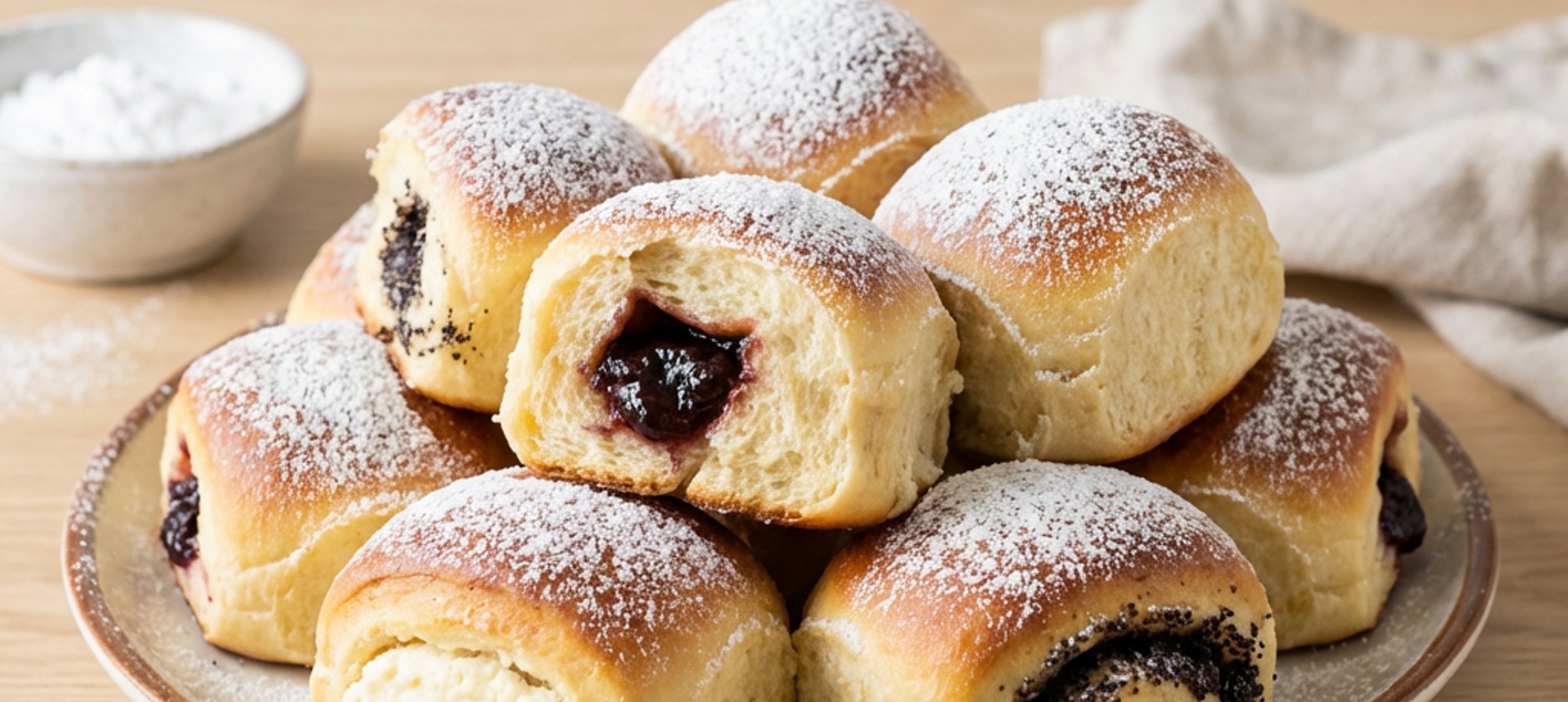 - 4A megkelt tésztát lisztezett felületen 1 cm vastagra nyújtjuk, és egy pohárral köröket szaggatunk belőle. Minden kör közepére teszünk egy teáskanálnyi tölteléket, a széleit ráhajtjuk és ujjainkkal szorosan összenyomjuk. A tenyerünkben gombóccá formázzuk, majd a záródással lefelé lisztezett felületre tesszük.