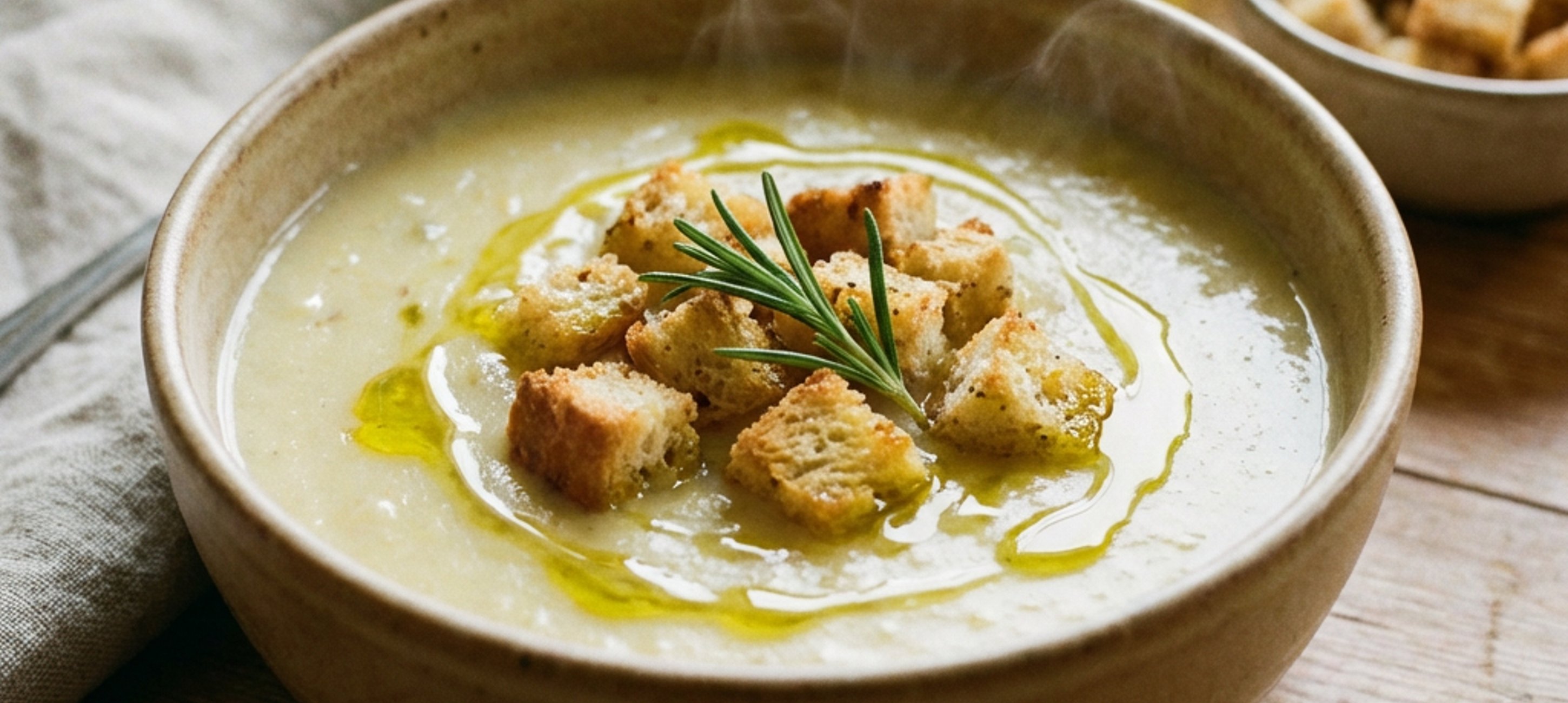 - 6A levest forrón tálaljuk a ropogós krutonnal és a felkarikázott újhagymával díszítve. Tipp: A még selymesebb állag érdekében a pürésítés után szitán is átpasszírozhatjuk.