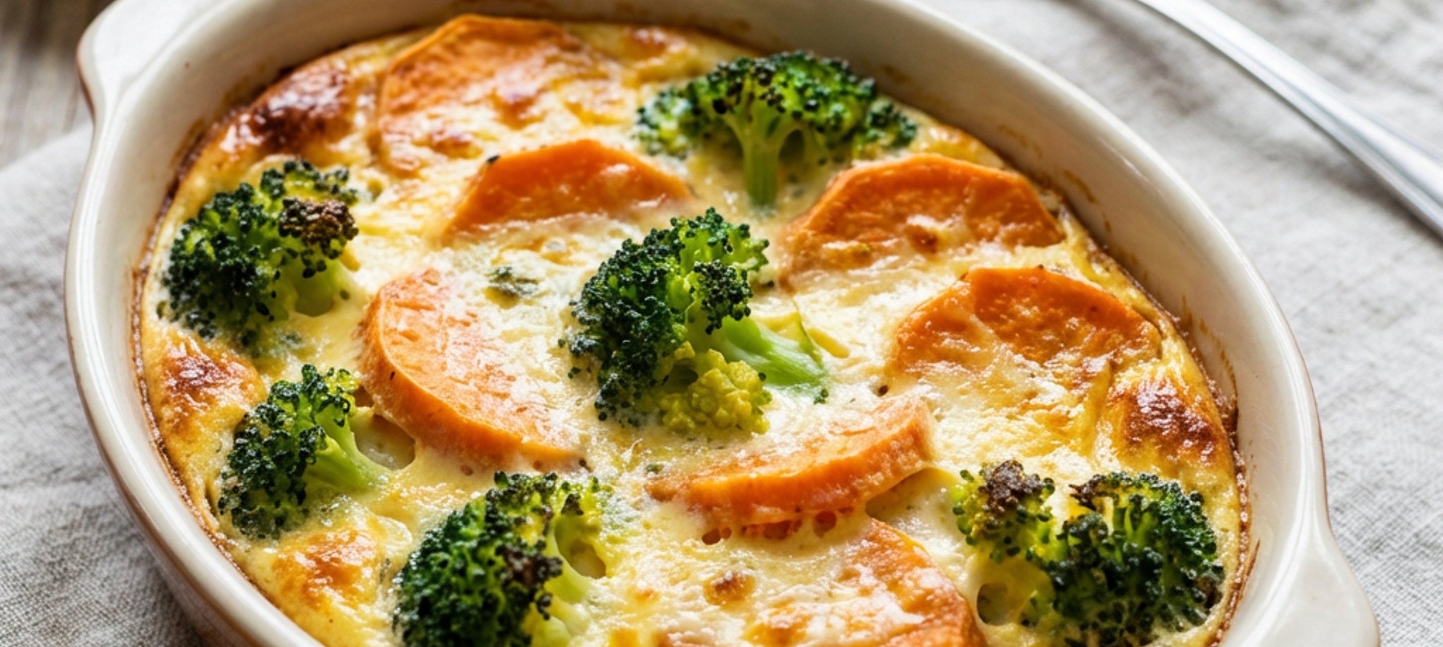 - 5A félkész brokkolit és édesburgonyát rendezzük el egy kisebb tűzálló tálban.