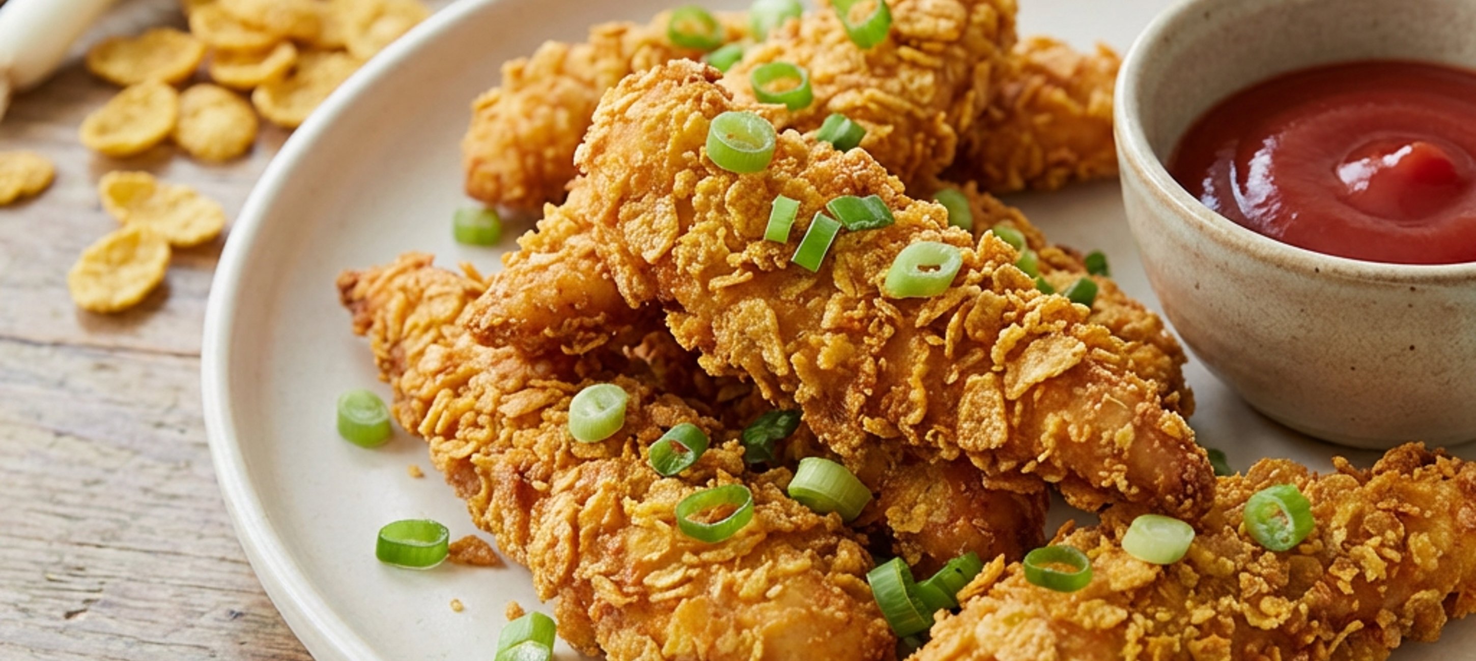 - 2A kukoricapelyhet öntsük egy másik tálba, és a kezünkkel morzsoljuk össze (nem baj, ha maradnak benne nagyobb darabok is). A húsdarabokat először mártsuk a tojásba, majd alaposan forgassuk meg a kukoricapehelyben.